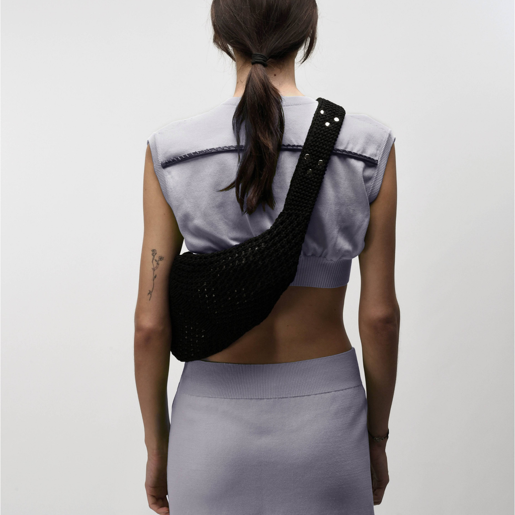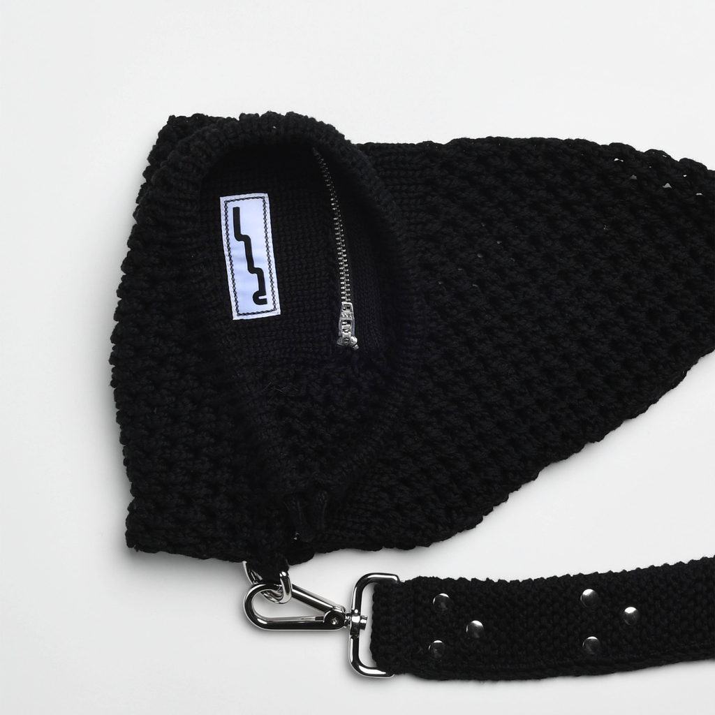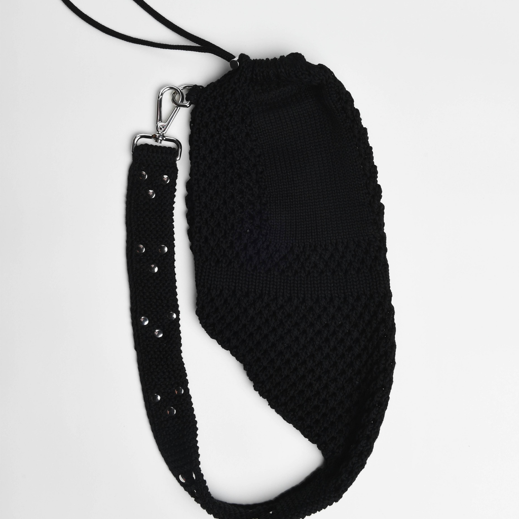 The signature rucksack decorated with flat rivets. This knitted mesh stitch sack features a metal cord lock closure and an incorporated zippered pocket for essential belongings. The belt is decorated with flat rivets arranged in a triangle geometric shape.