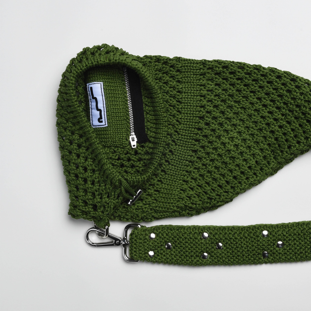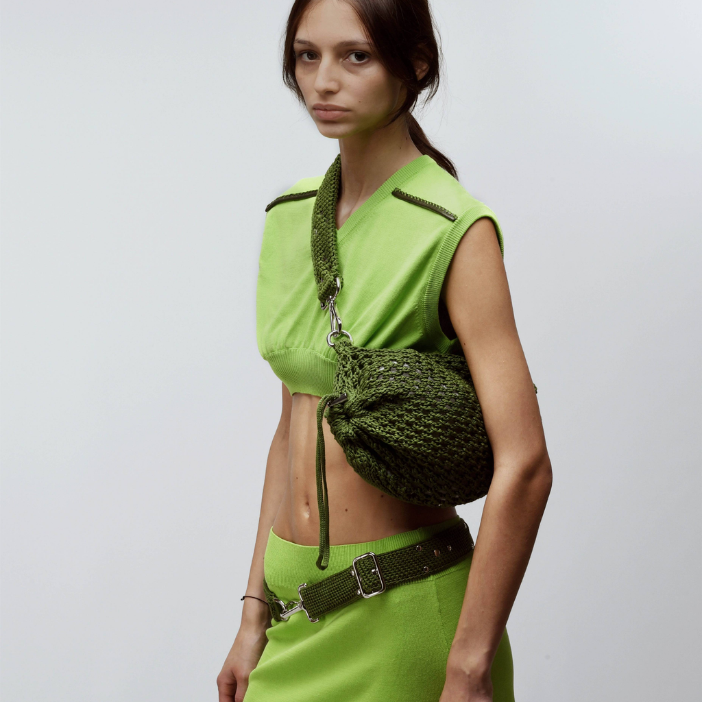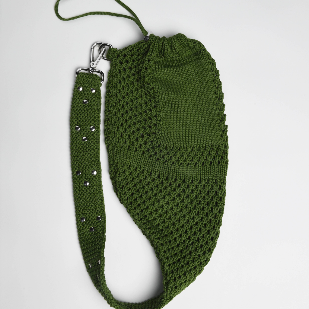 The signature rucksack decorated with flat rivets. This knitted mesh stitch sack features a metal cord lock closure and an incorporated zippered pocket for essential belongings. The belt is decorated with flat rivets arranged in a triangle geometric shape.