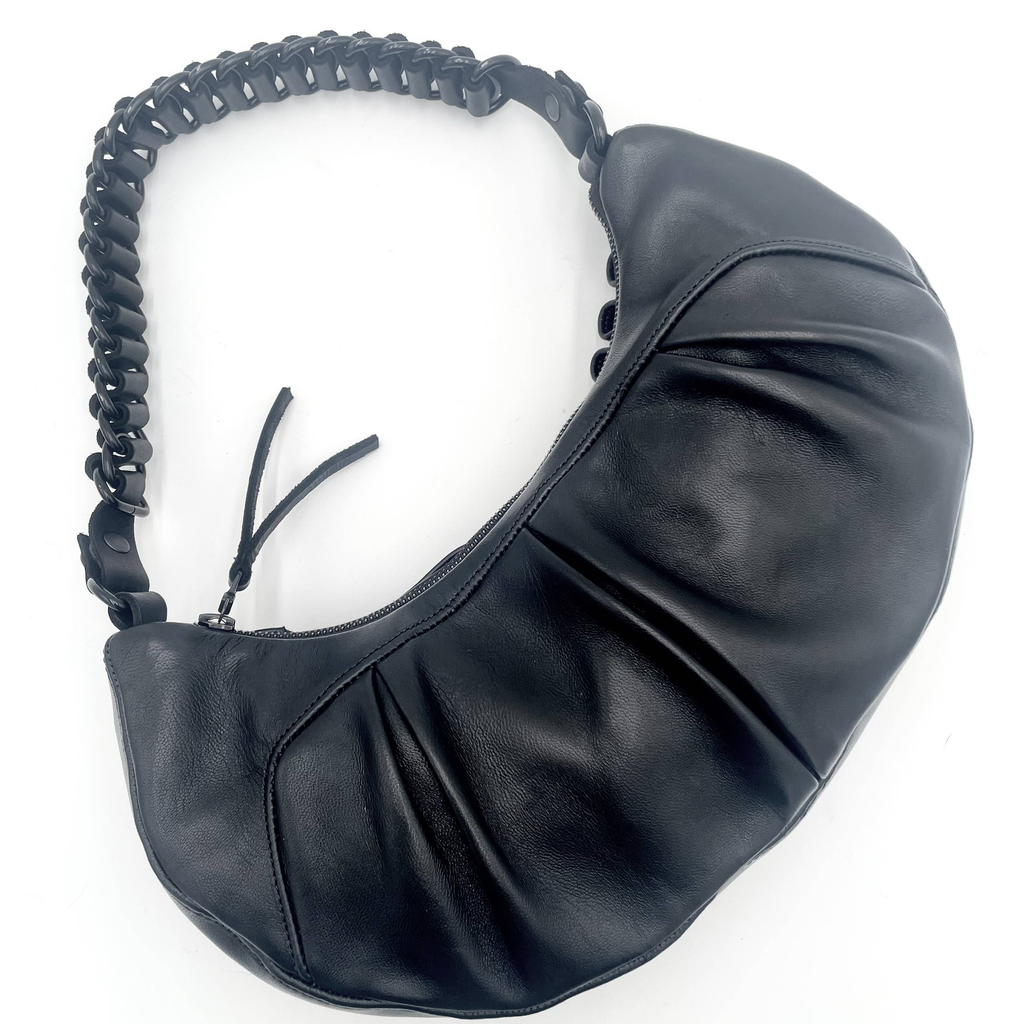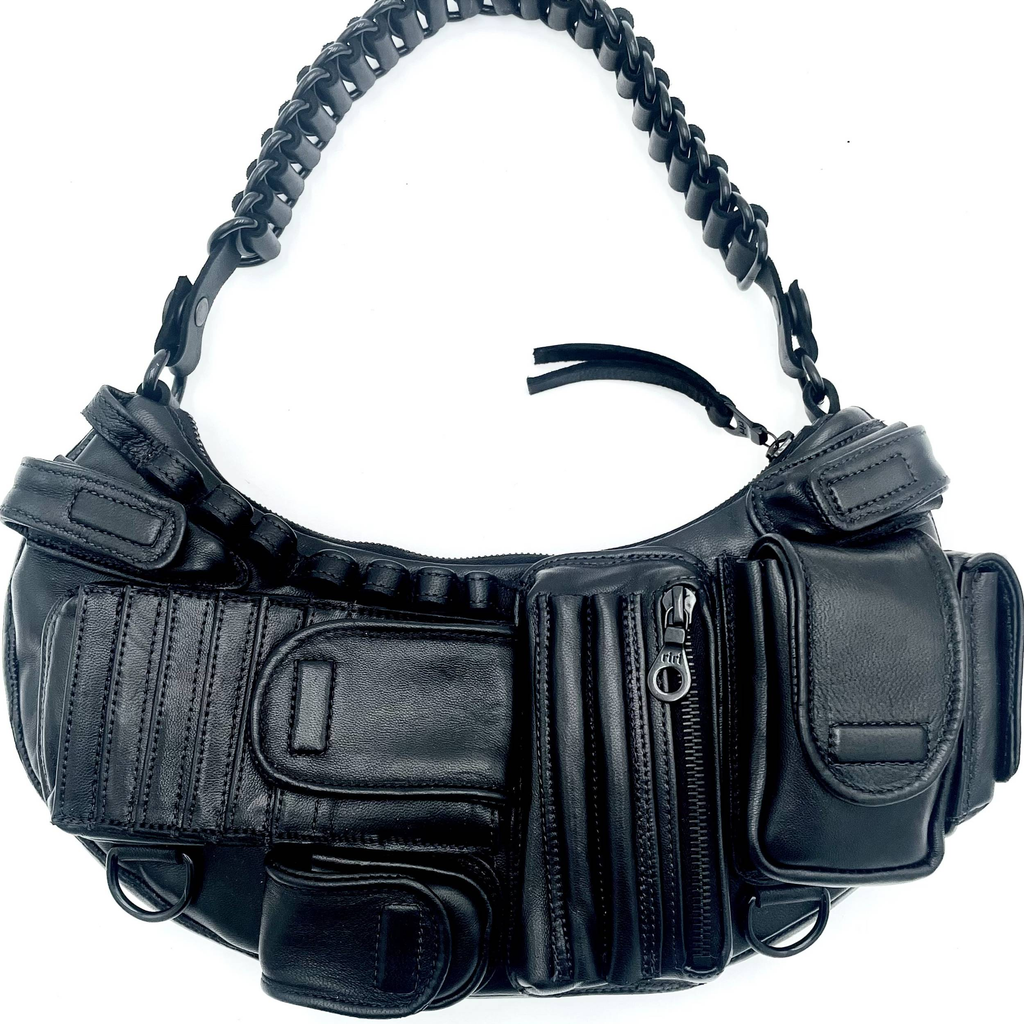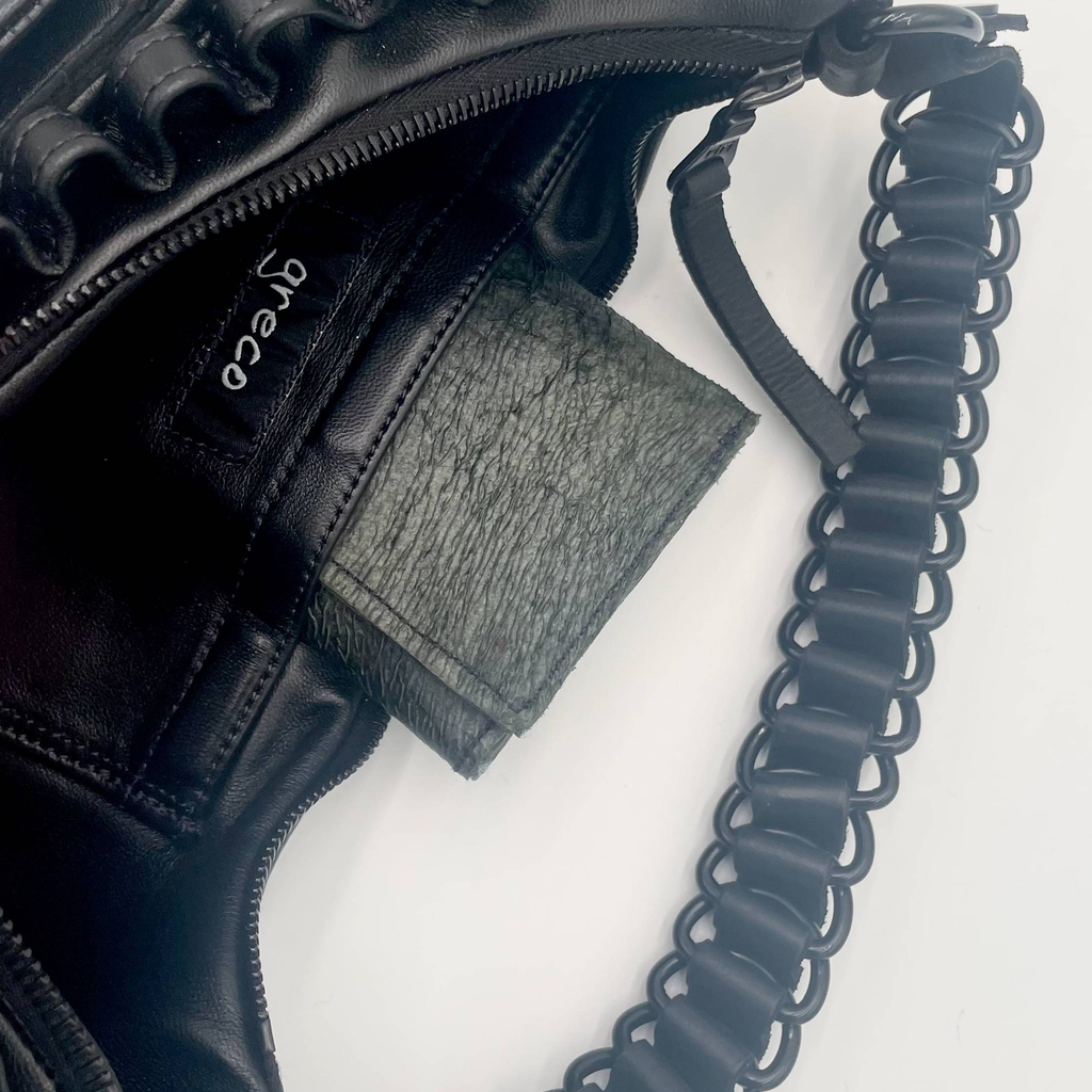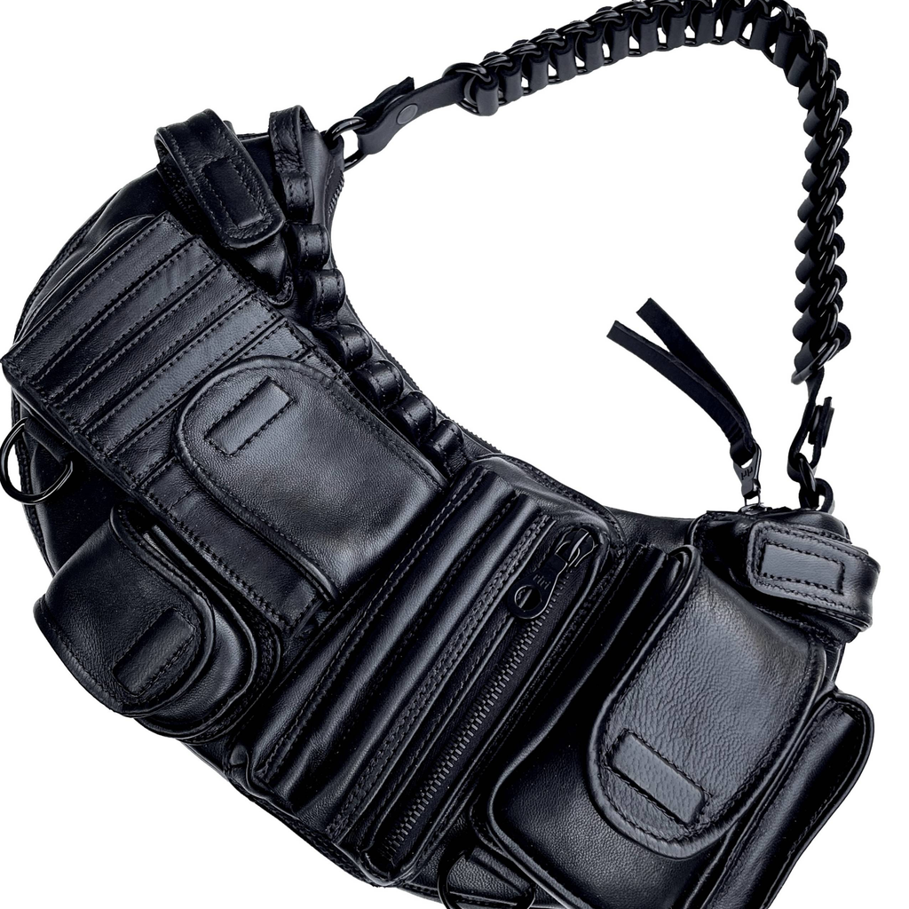 Utility Combat Purse by GRECO constructed of premium Italian nappa lambskin. 6 exterior magnetic pockets, 1 exterior zipper pocket with pen holder, 2 exterior D rings and loop system for attachments, interior magnetic pocket. Main riri zipper with leather puller. Woven metal/leather detachable melee strap with heavy duty line 20 snaps. Pleated back side.