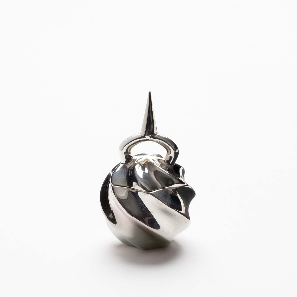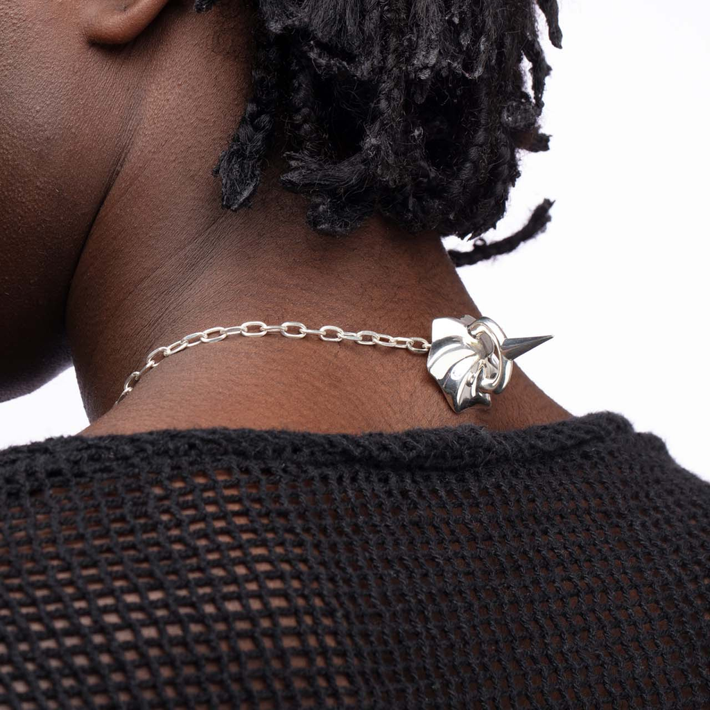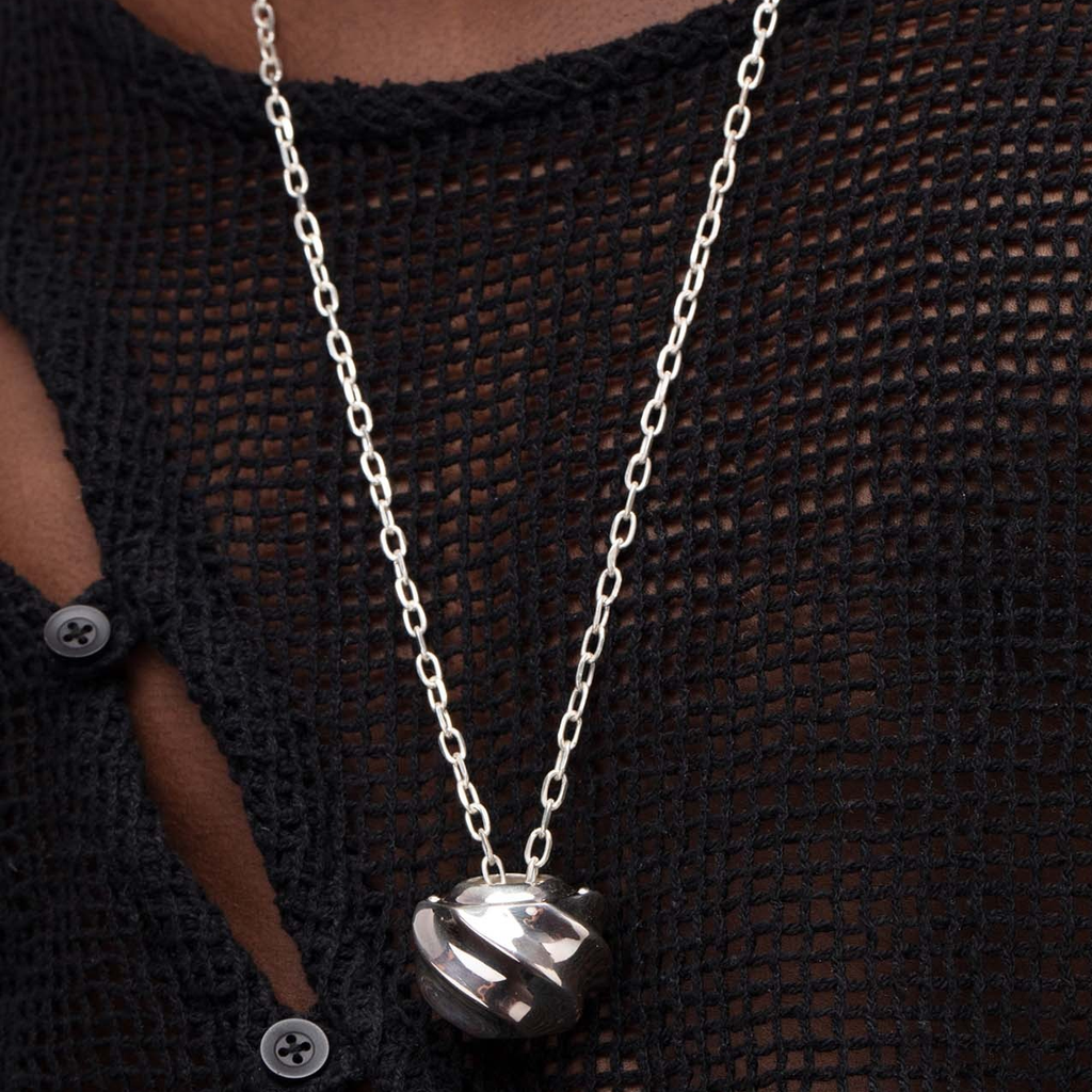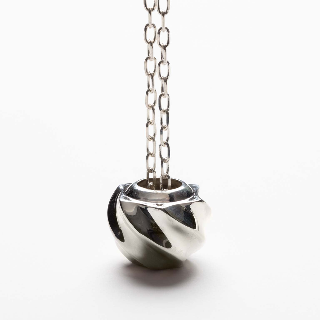Charm in the shape of a box with an oval link chain. The necklace when not worn has the function of a sculpture. The chain can be stored inside the charm.