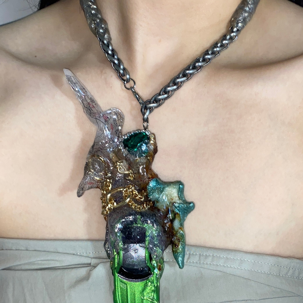 Materials: resin / metal chain / synthetic plastic polymer / up cycled materials