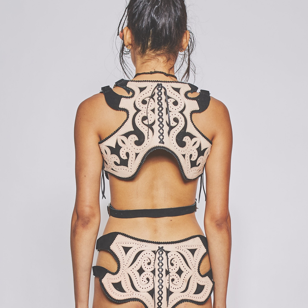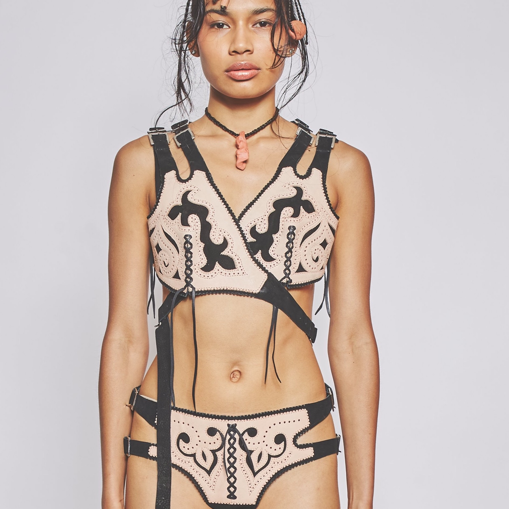 Veg-tan leather bra produced in partnership with leathersmith Irineu do Mestre.