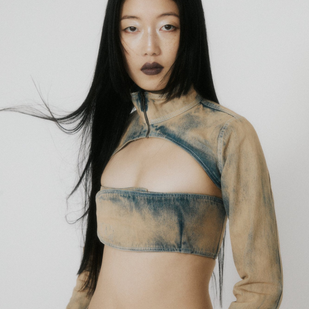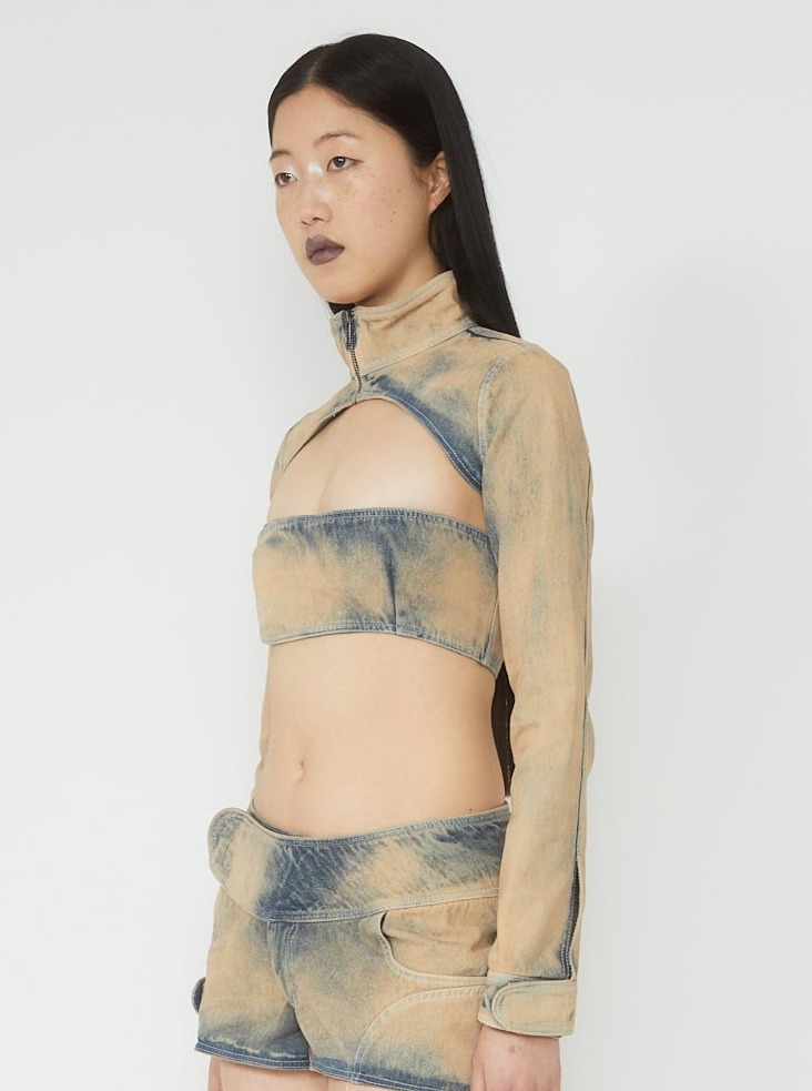 Beige washed denim bandeau top. Adjustable asymmetrical velcro closure.