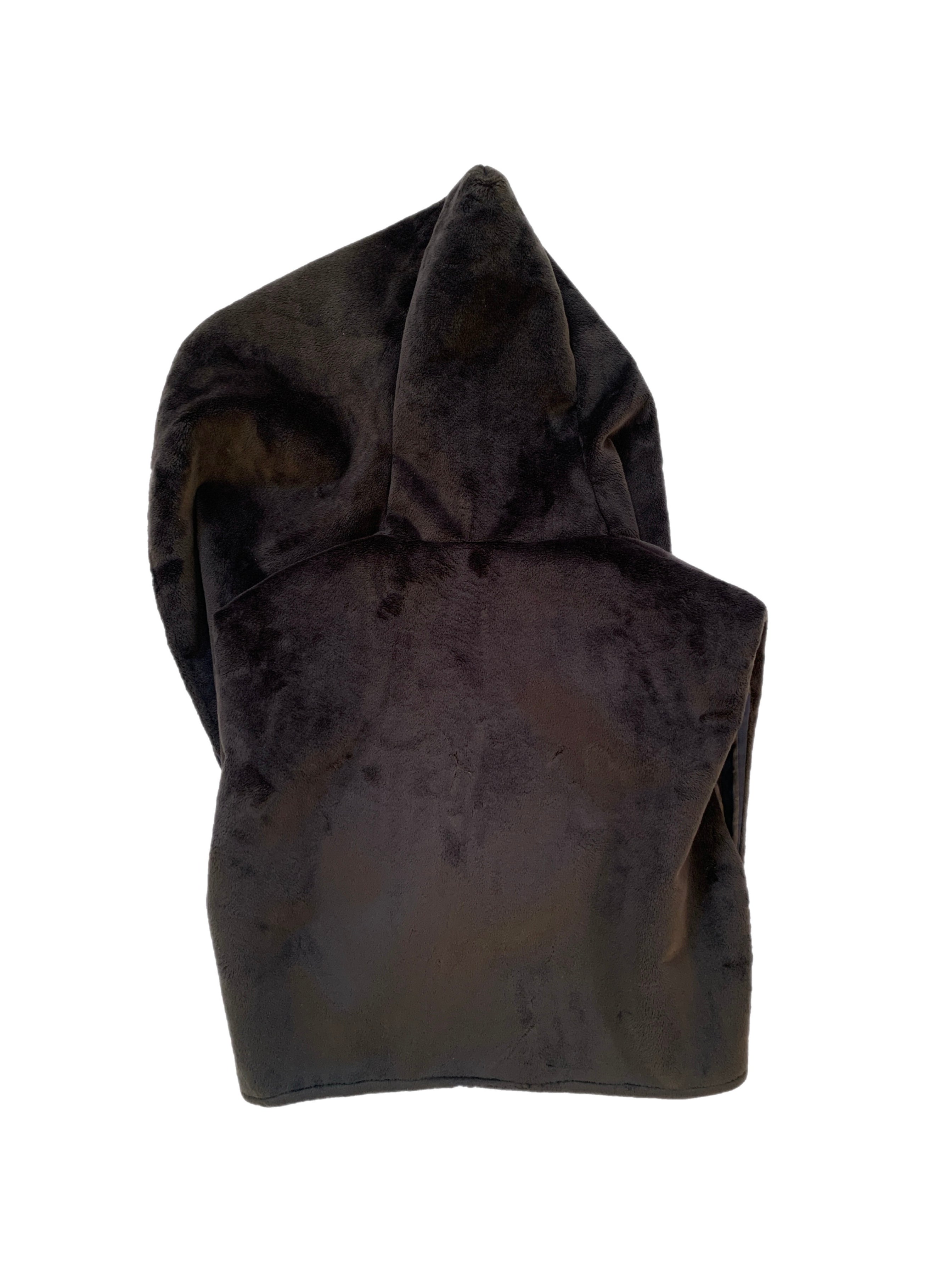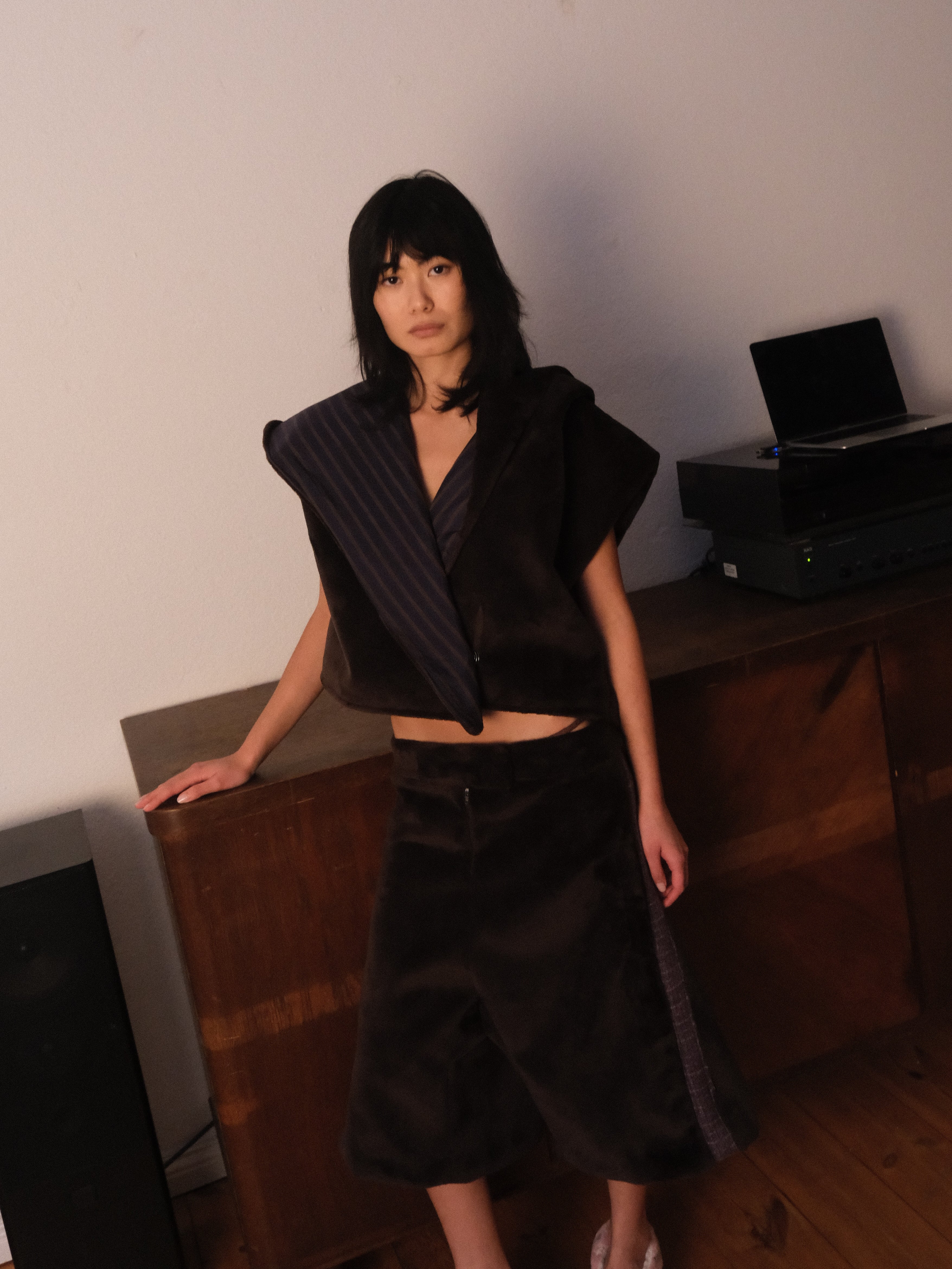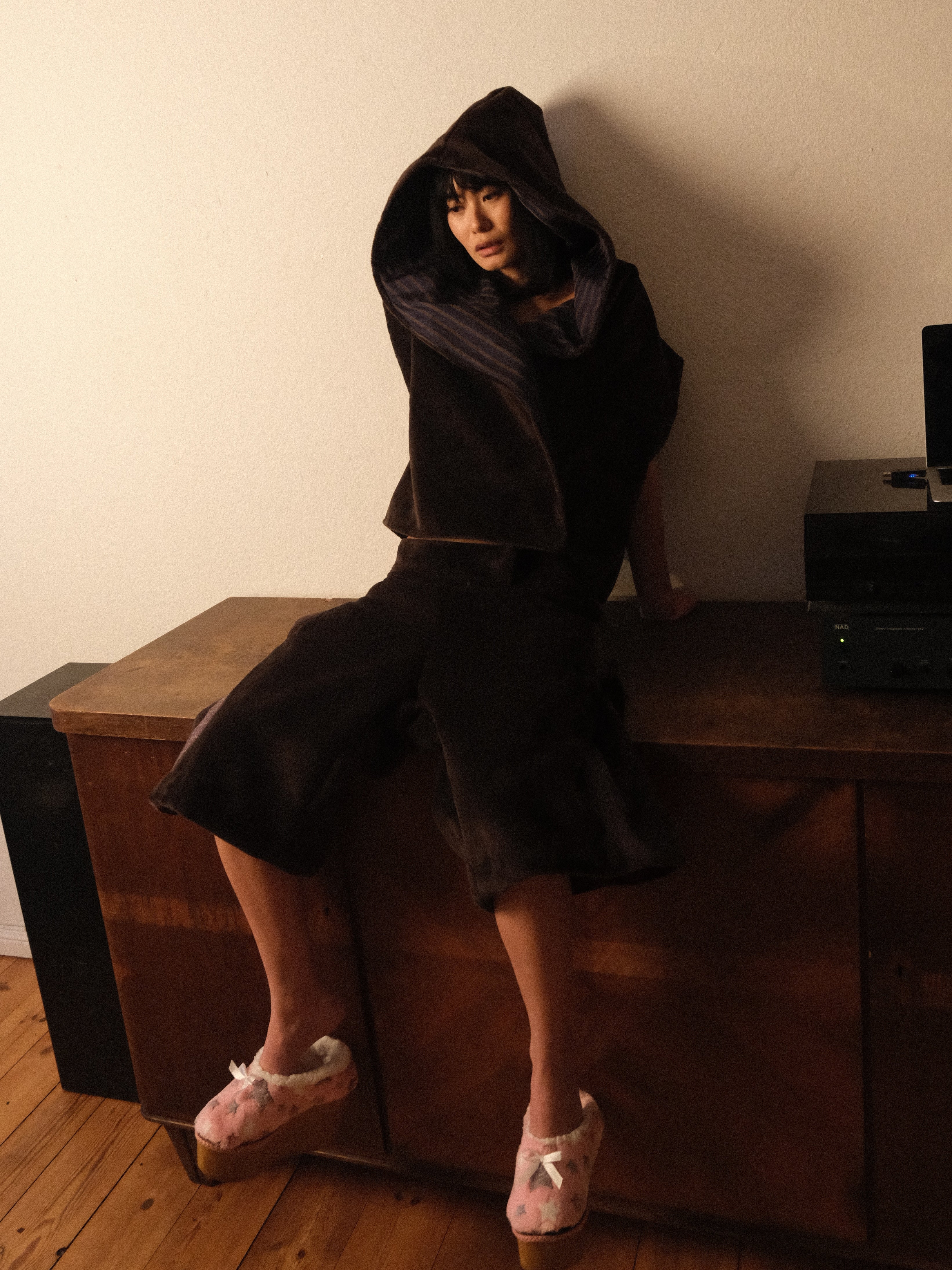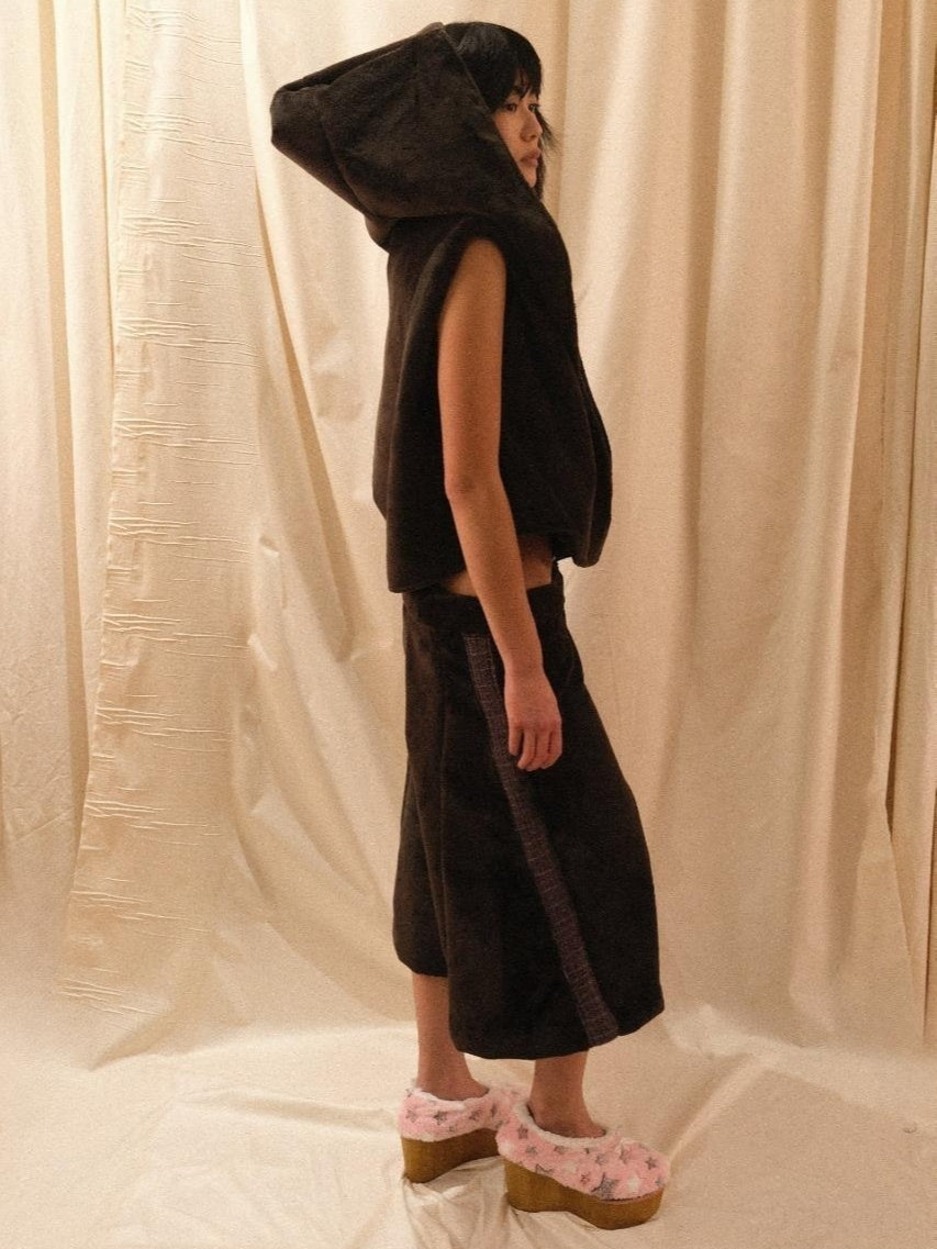 Hooded vest made from velvet velour with contrasting strip lining. Designed with a voluminous hood and a relaxed fit, the piece closes with press buttons. Part of the lounge collection created in collaboration with the berlin-based studio good & bad.