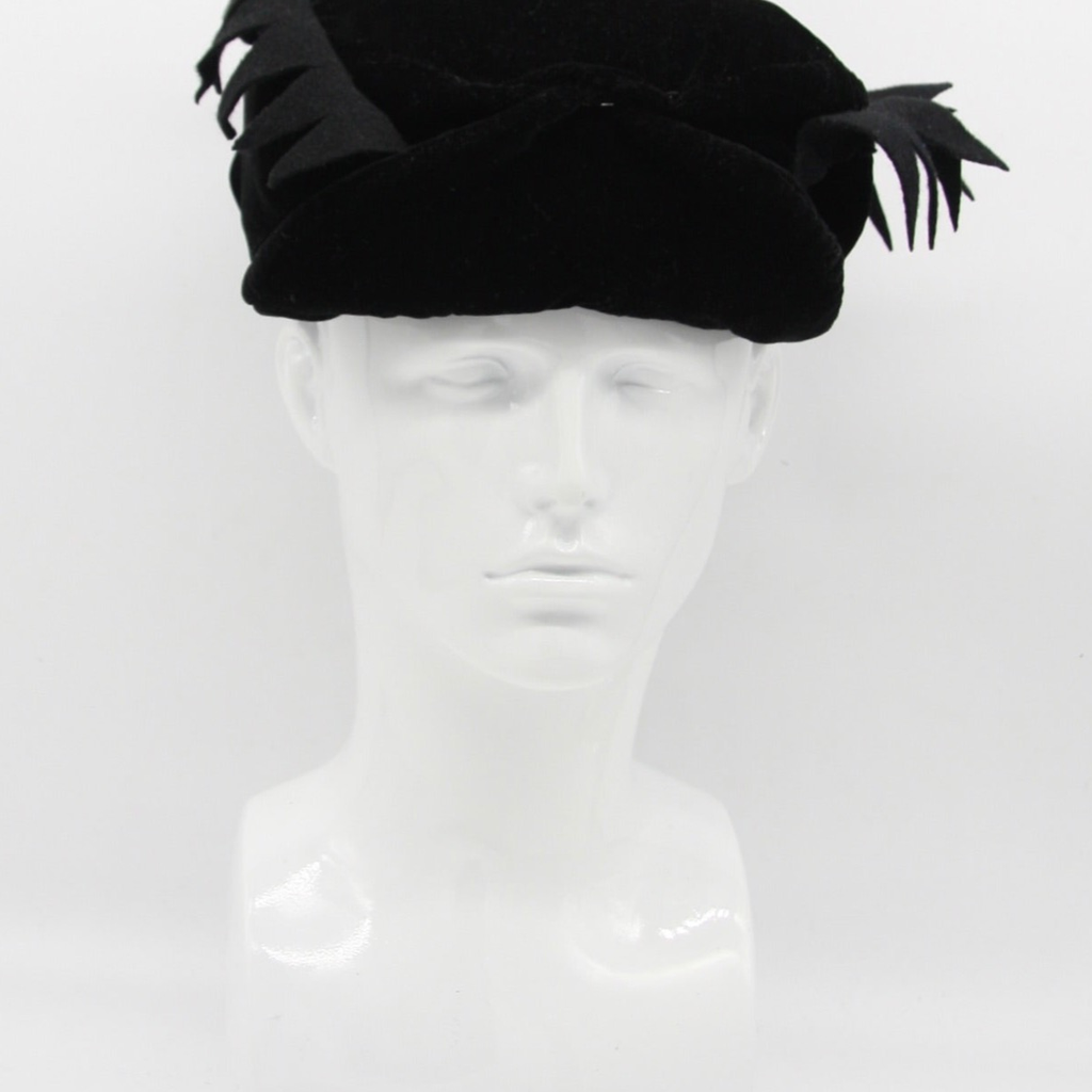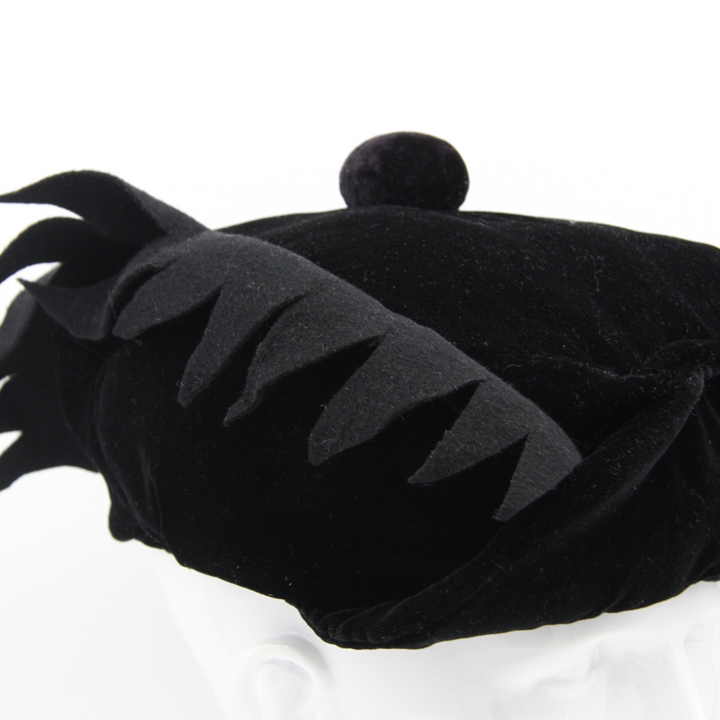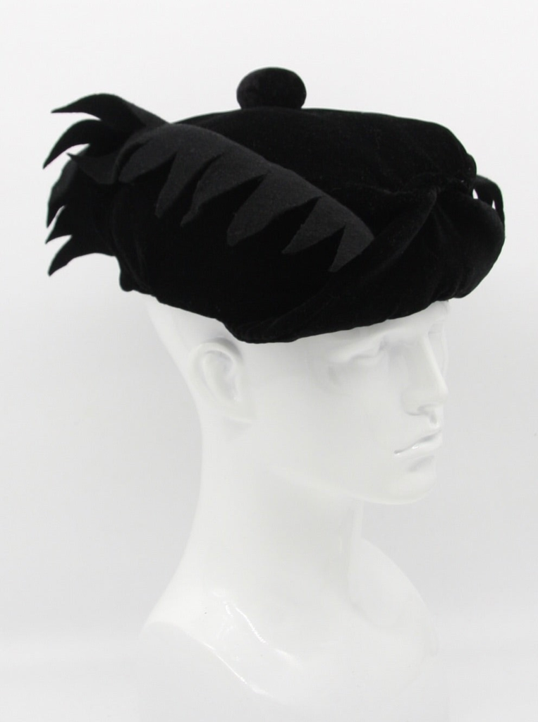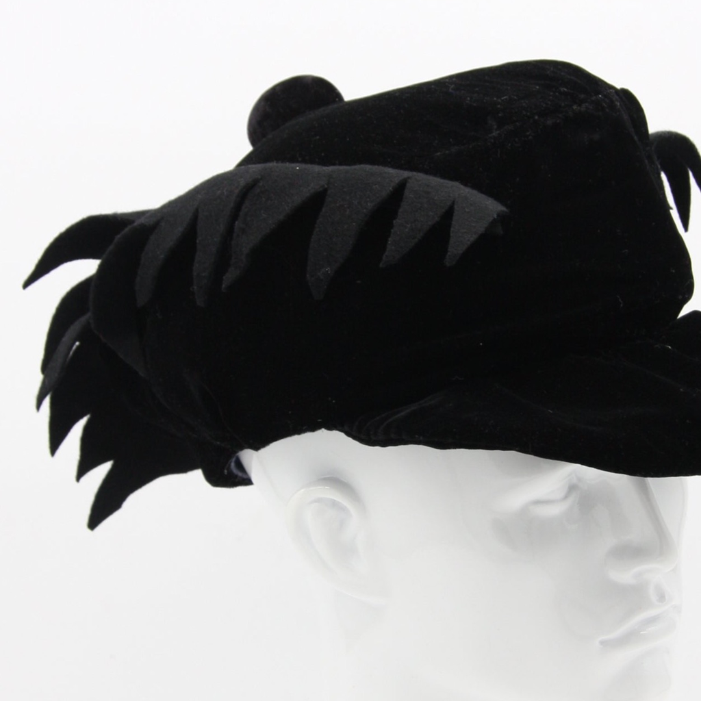 Black velvet hat - with stuffing - so it has a puffy feelWonky black wool jagged wings on the sideBrim can be pinned up or downDue to the padded nature one size fits most