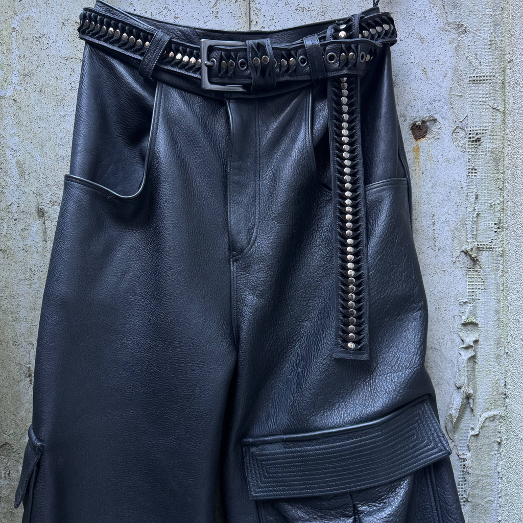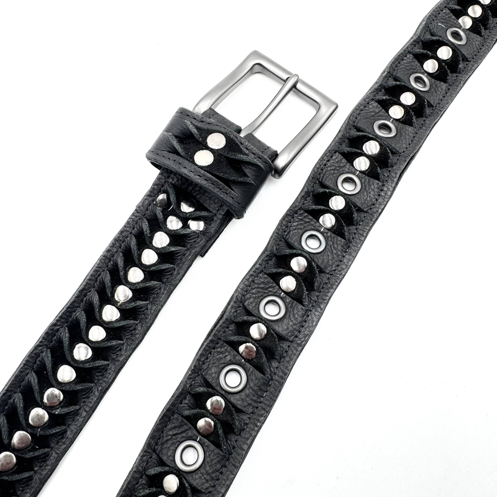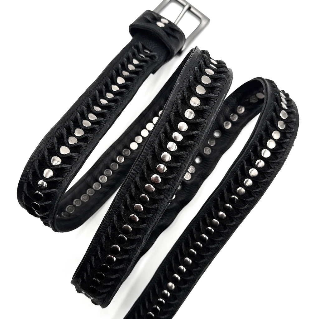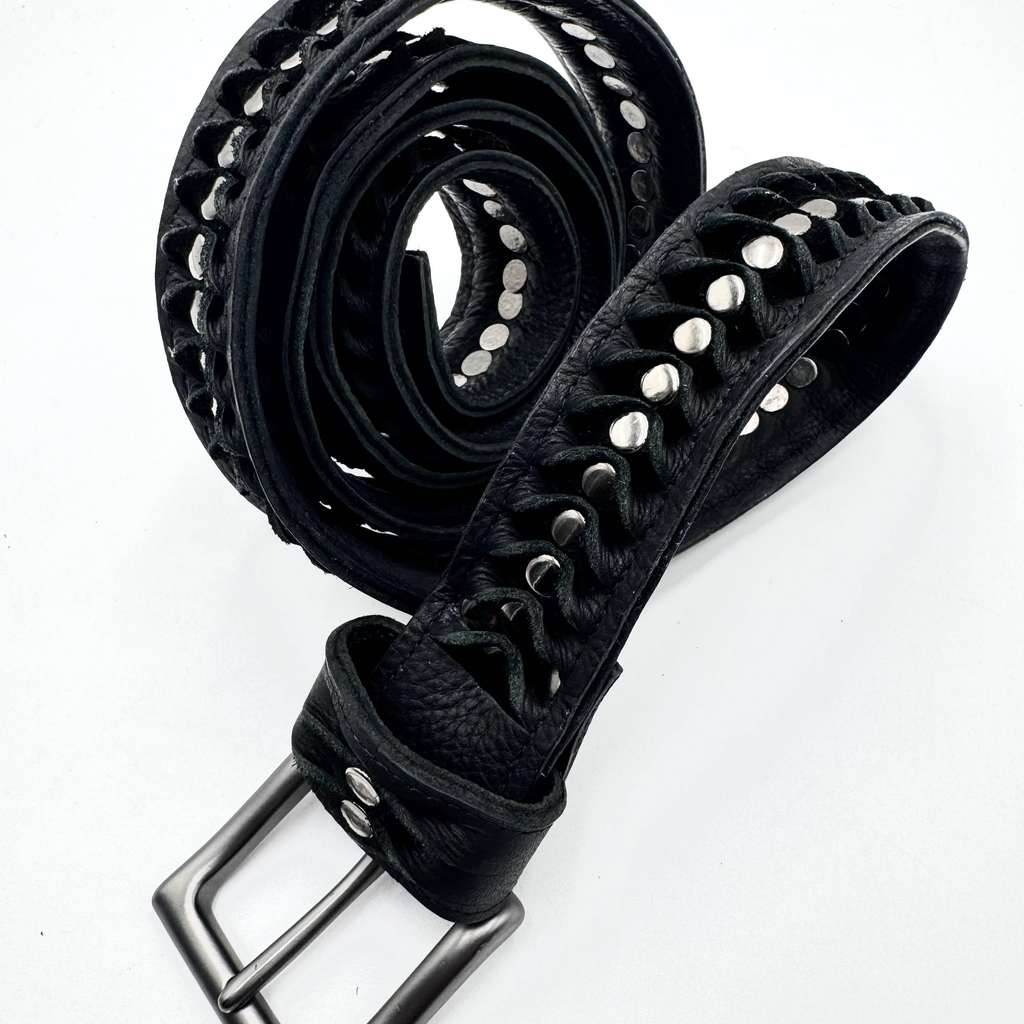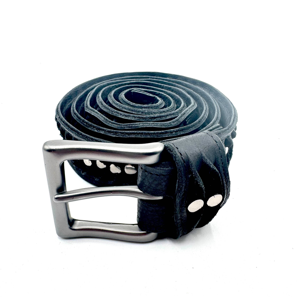 Vertebrae Belt by GRECO constructed from two layers of heavy German cowhide. antiqued silver belt buckle. Gunmetal rivets and eyelets hammered by hand with a leather flip technique, enabling items to be attached anywhere on the belt.