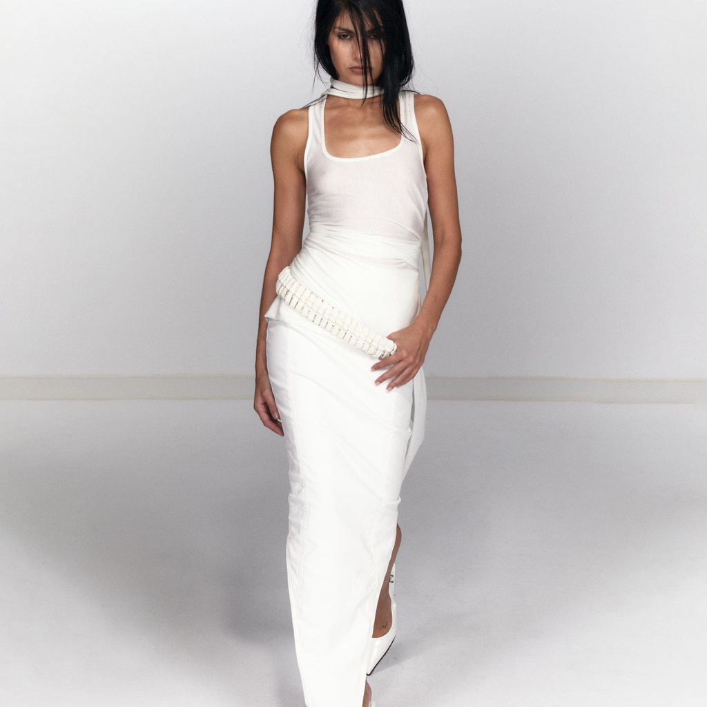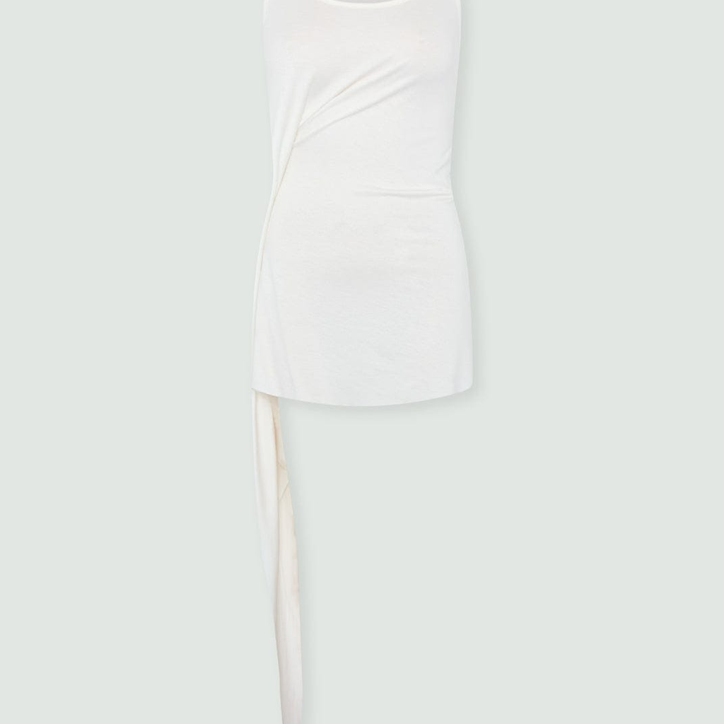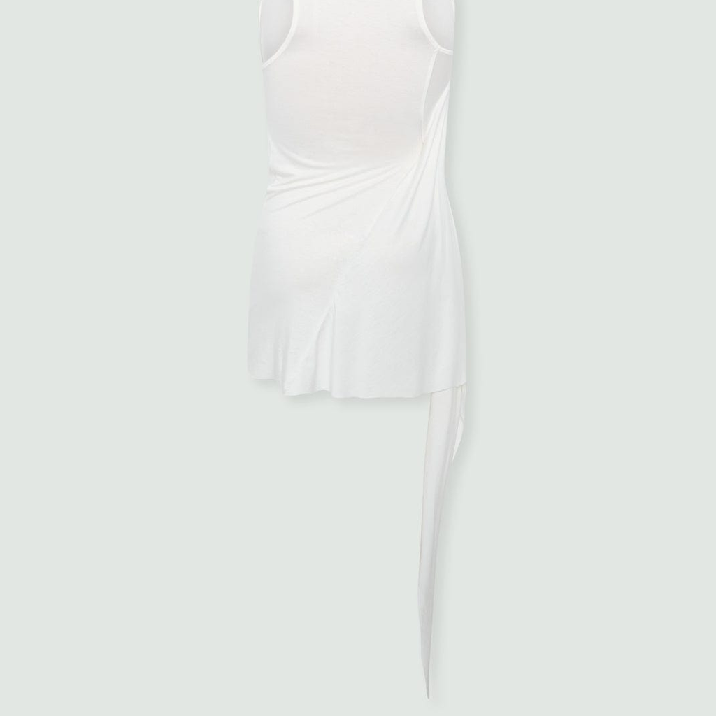 Asymmetric white cotton tank top with pleating towards the back. Upper slim fit but lose at the bottom. Raw edge bottom. Binding around neck and armholes.