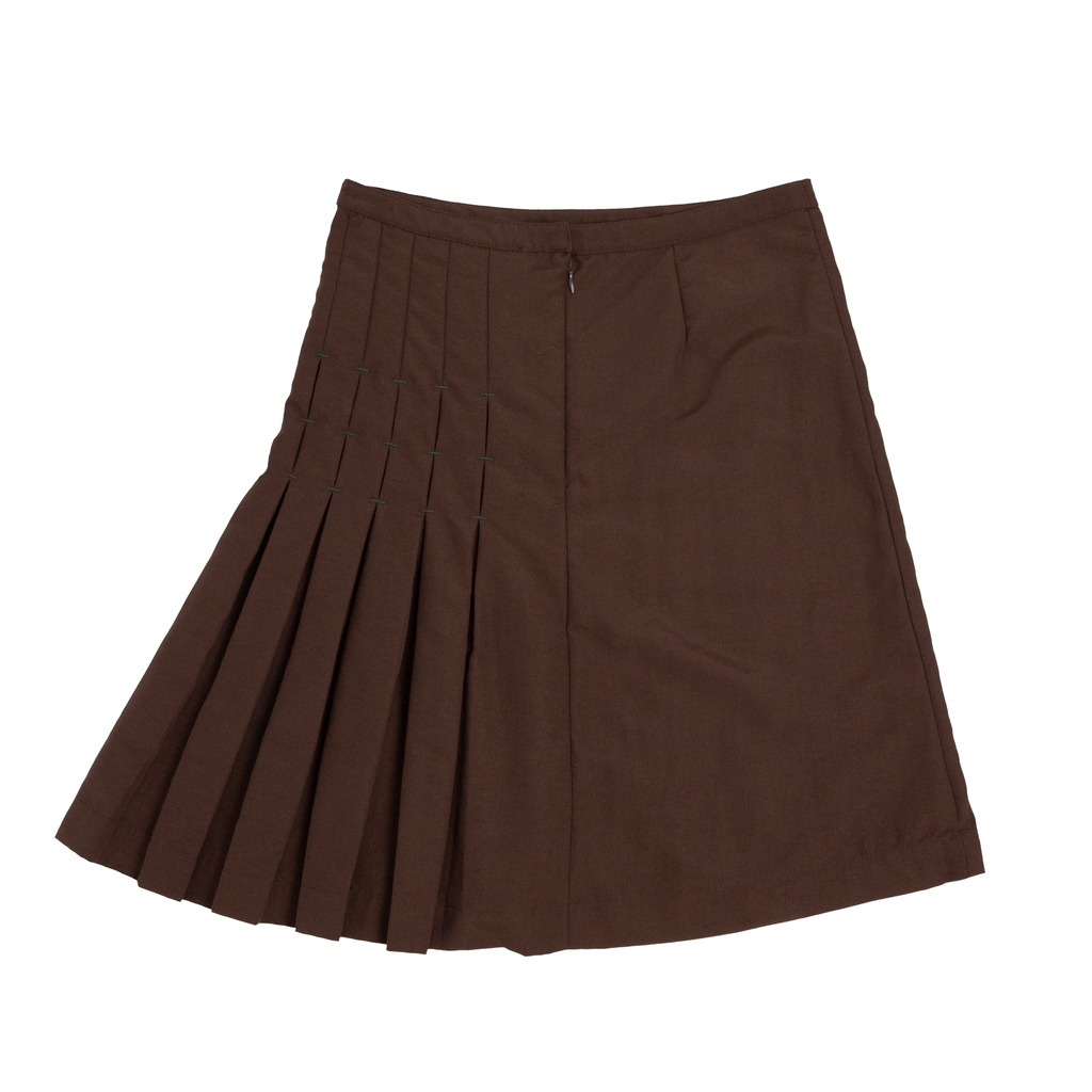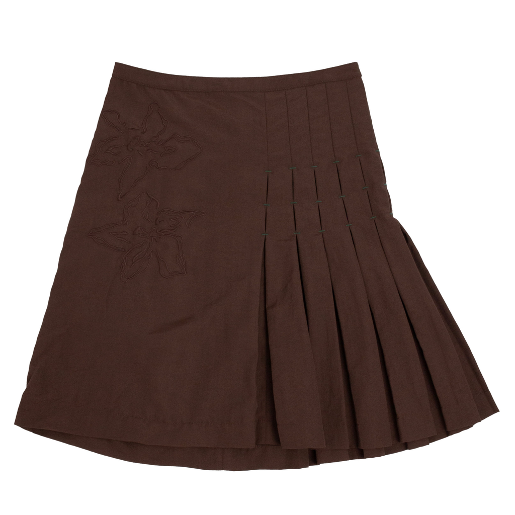 Carob pleated skirt with contrast box pleats and tonal floral embroidery