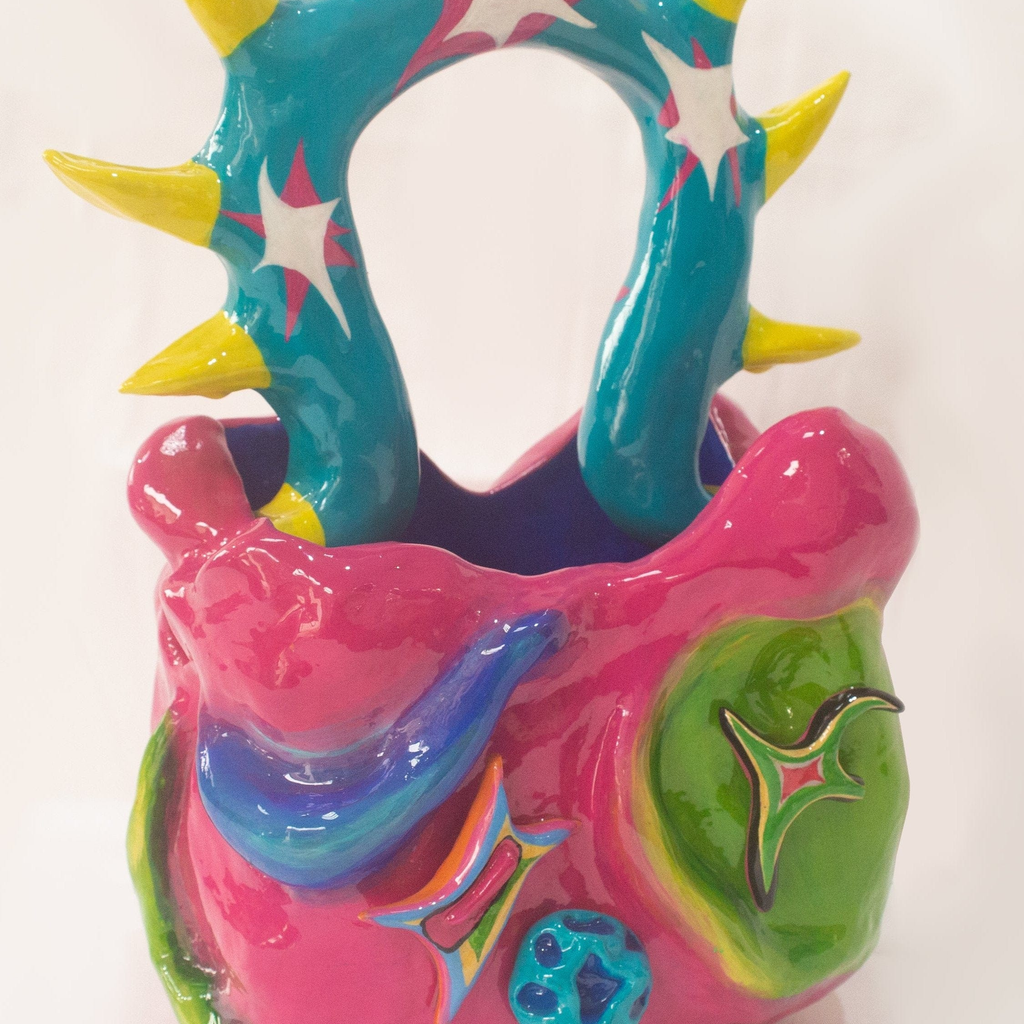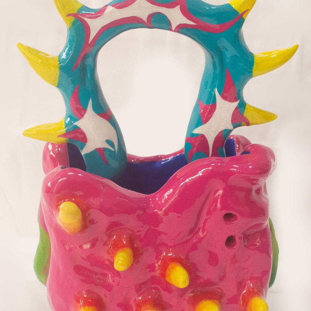 Multi-coloured ceramic bag with yellow spikes on the handle and in the front with ornaments on the back.