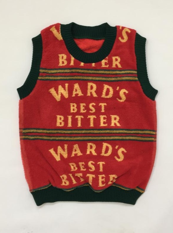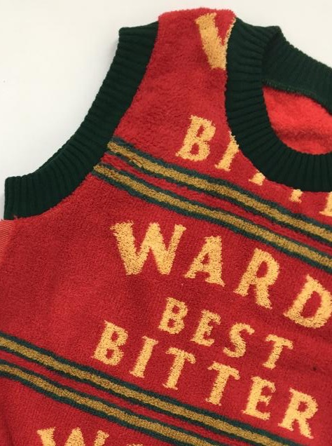 Upcycled beer towel vest by Adam Jones made featuring ribbed trimmings and a plain black back.