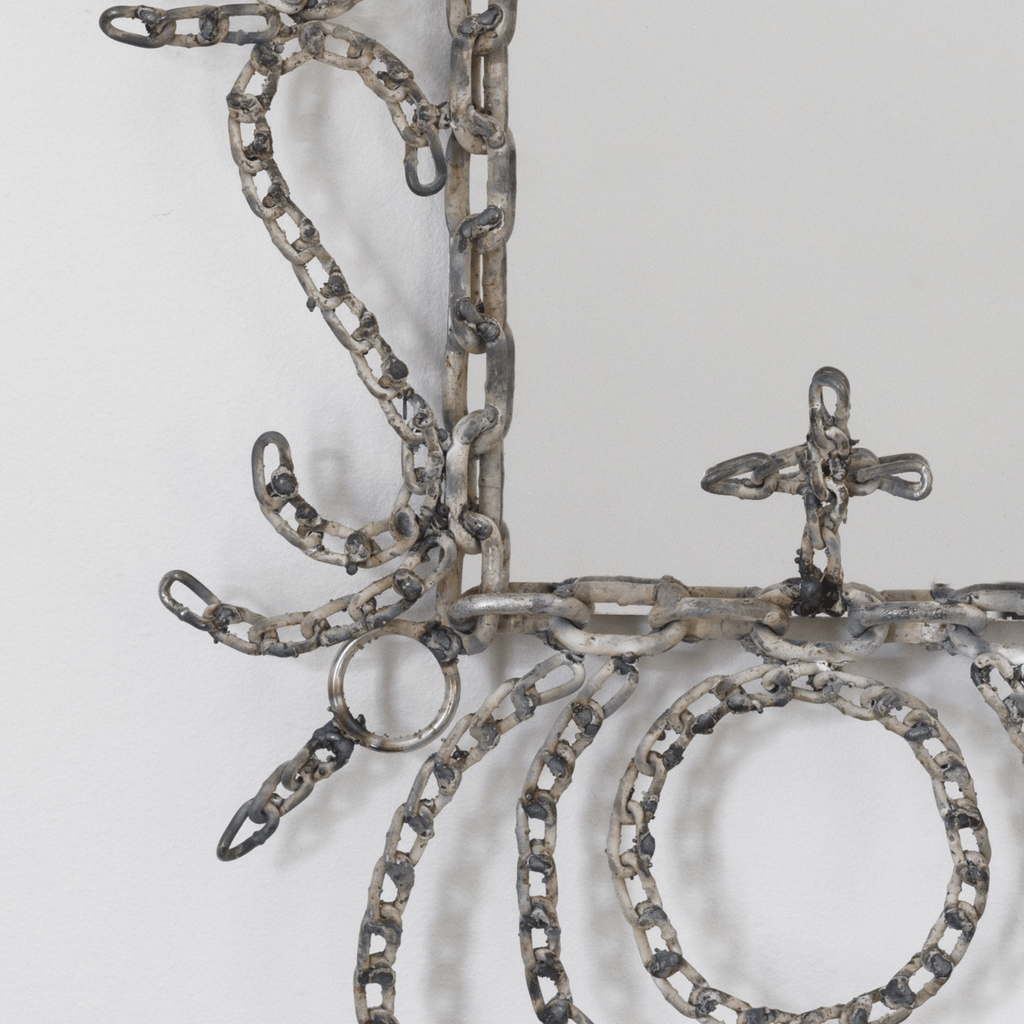 The welded galvanised chain offers a unique patina reminiscent of a ceramic shell juxtaposed with a crystal clear mirror.
