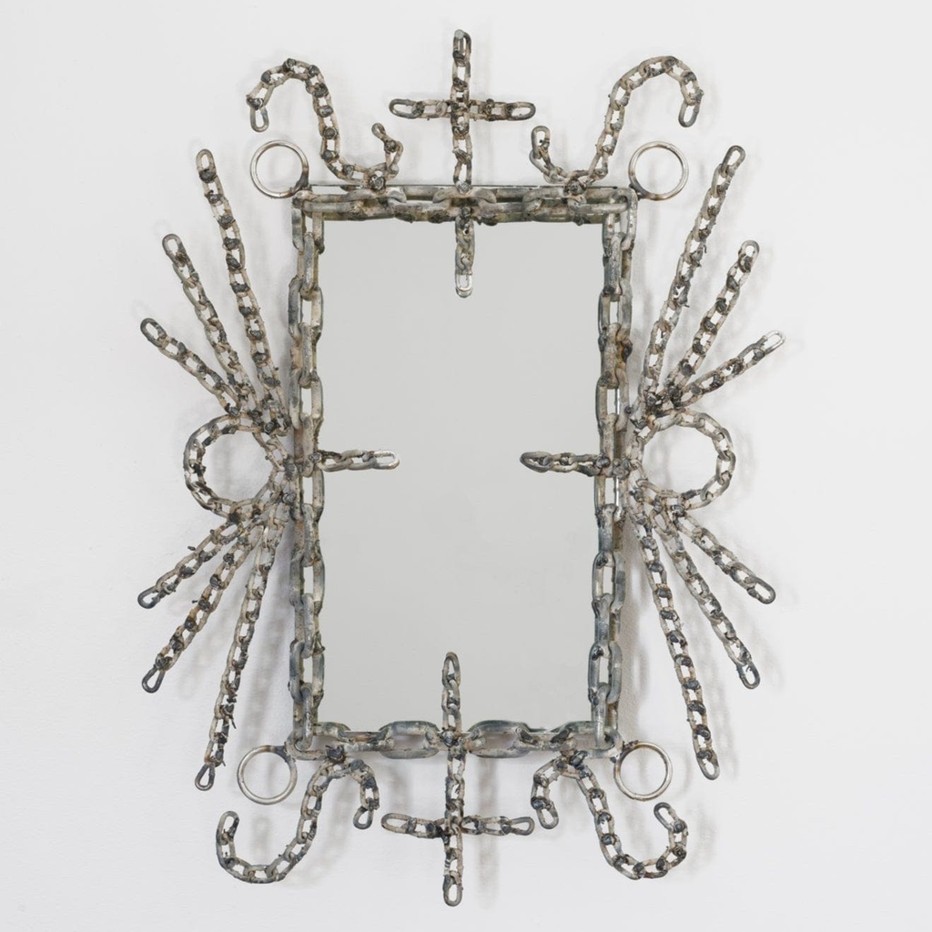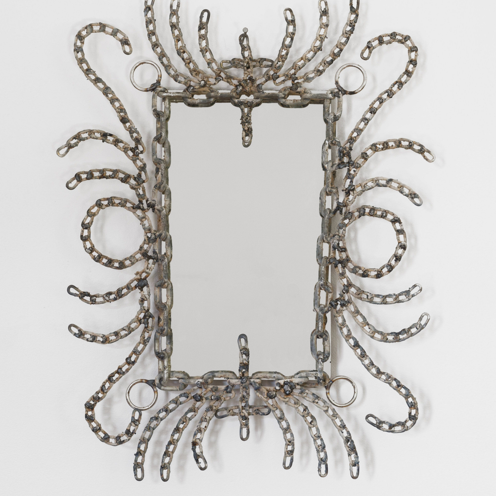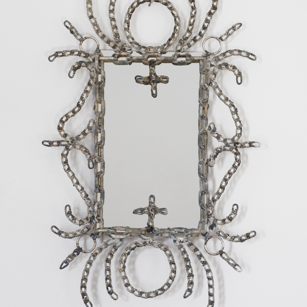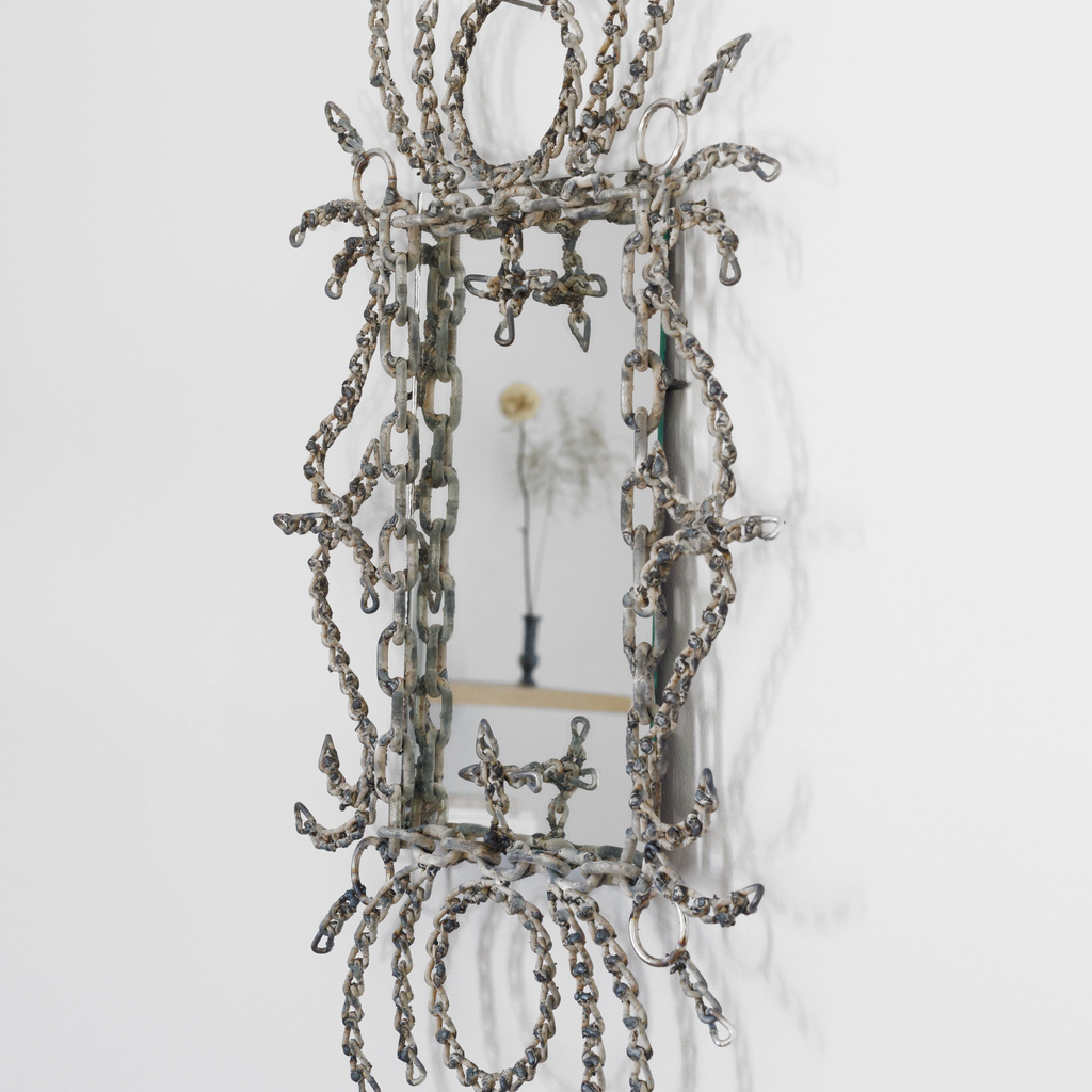 The welded galvanised chain offers a unique patina reminiscent of a ceramic shell juxtaposed with a crystal clear mirror.