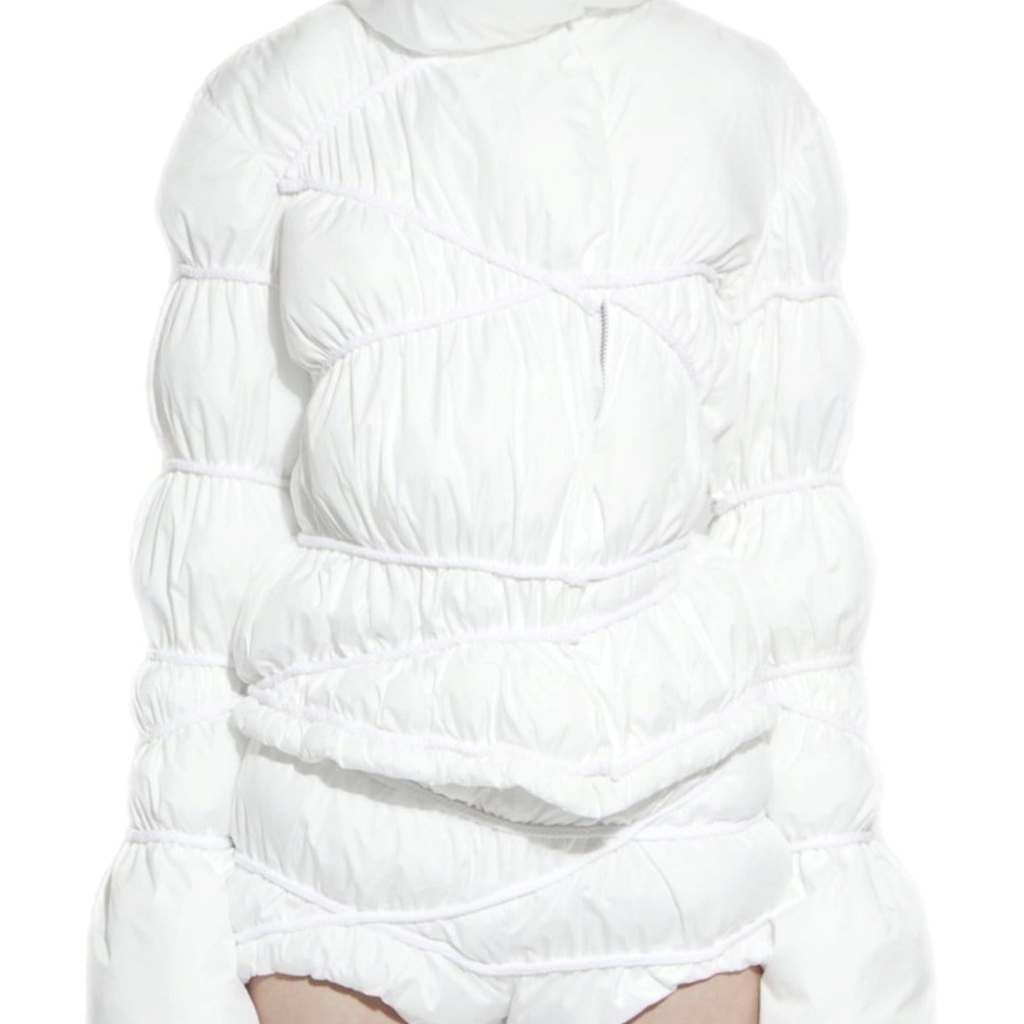 Fitted puffer jacket with ruching and rope detailing throughout, asymmetrical zipper placement, two way zip, stand collar, satin lining.
