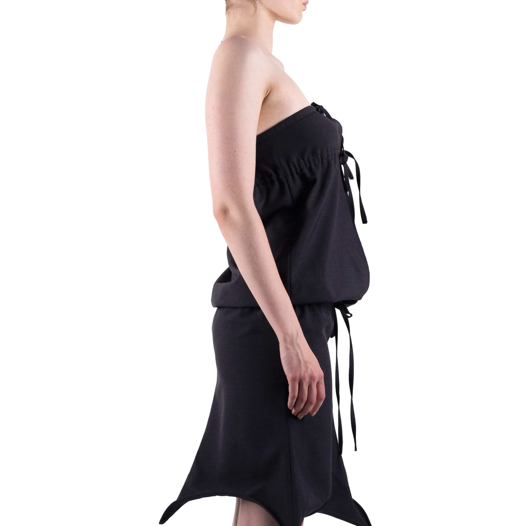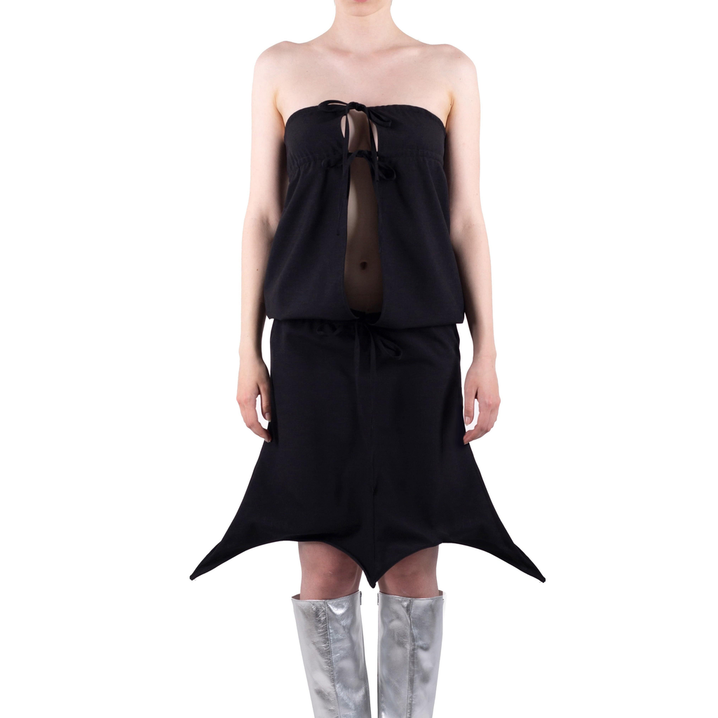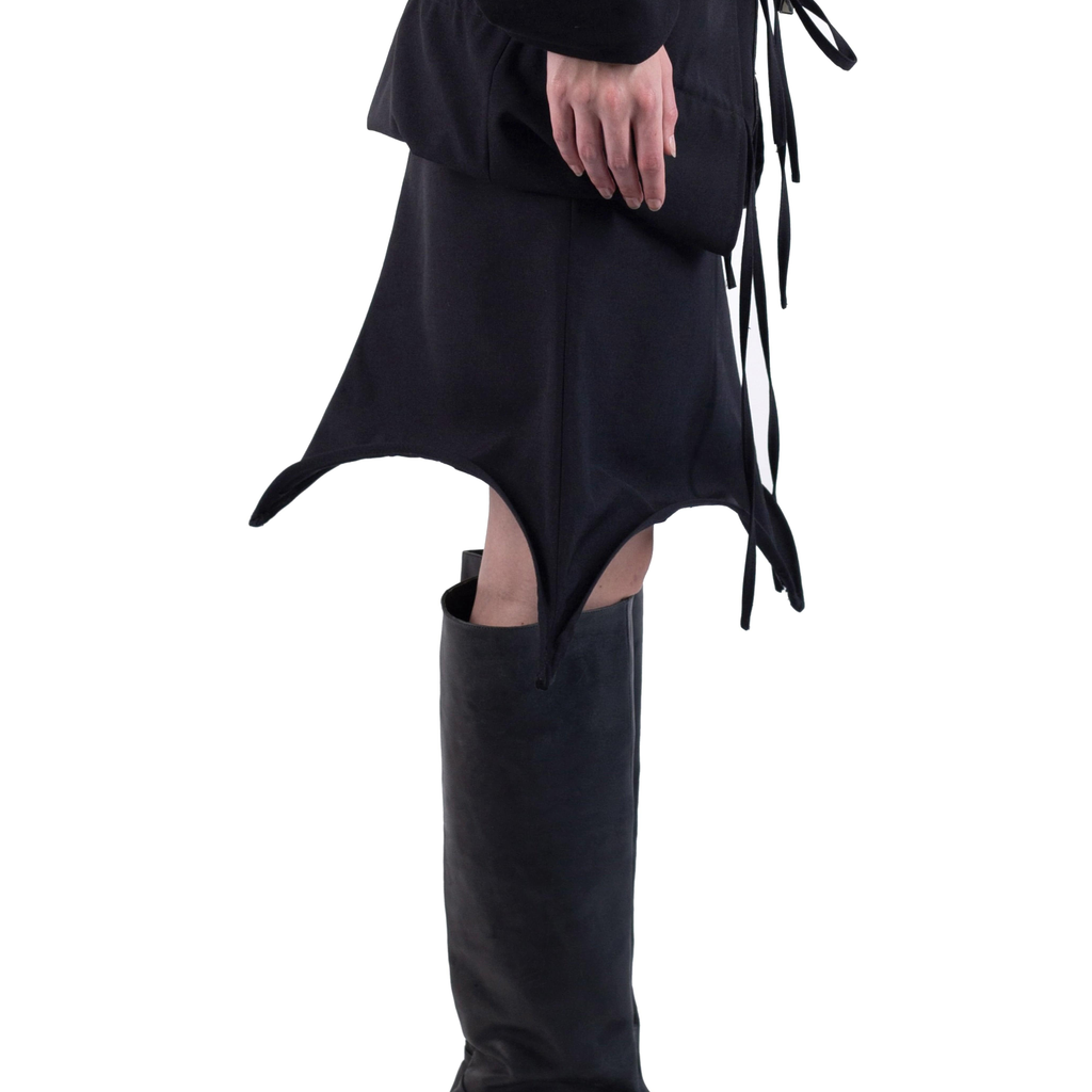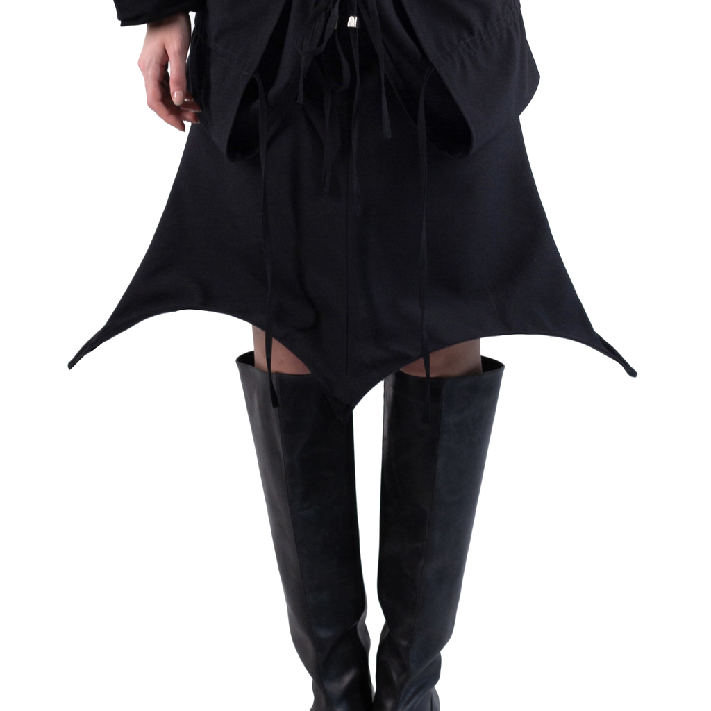 Wool midi dress featuring a spike design throughout. Hidden wire at the bottom. Double self tie closure at front. Self tie closure at skirt front. Can be styled as a skirt.