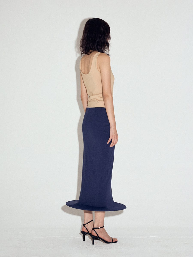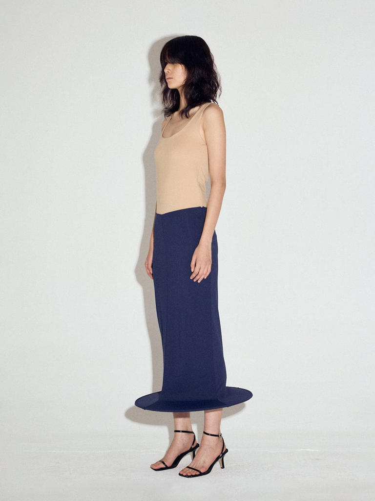 Wired hem cylinder skirt in Navy. Stretch nylon jersey fabric. Fully lined. Steel wire inserted at the hem.