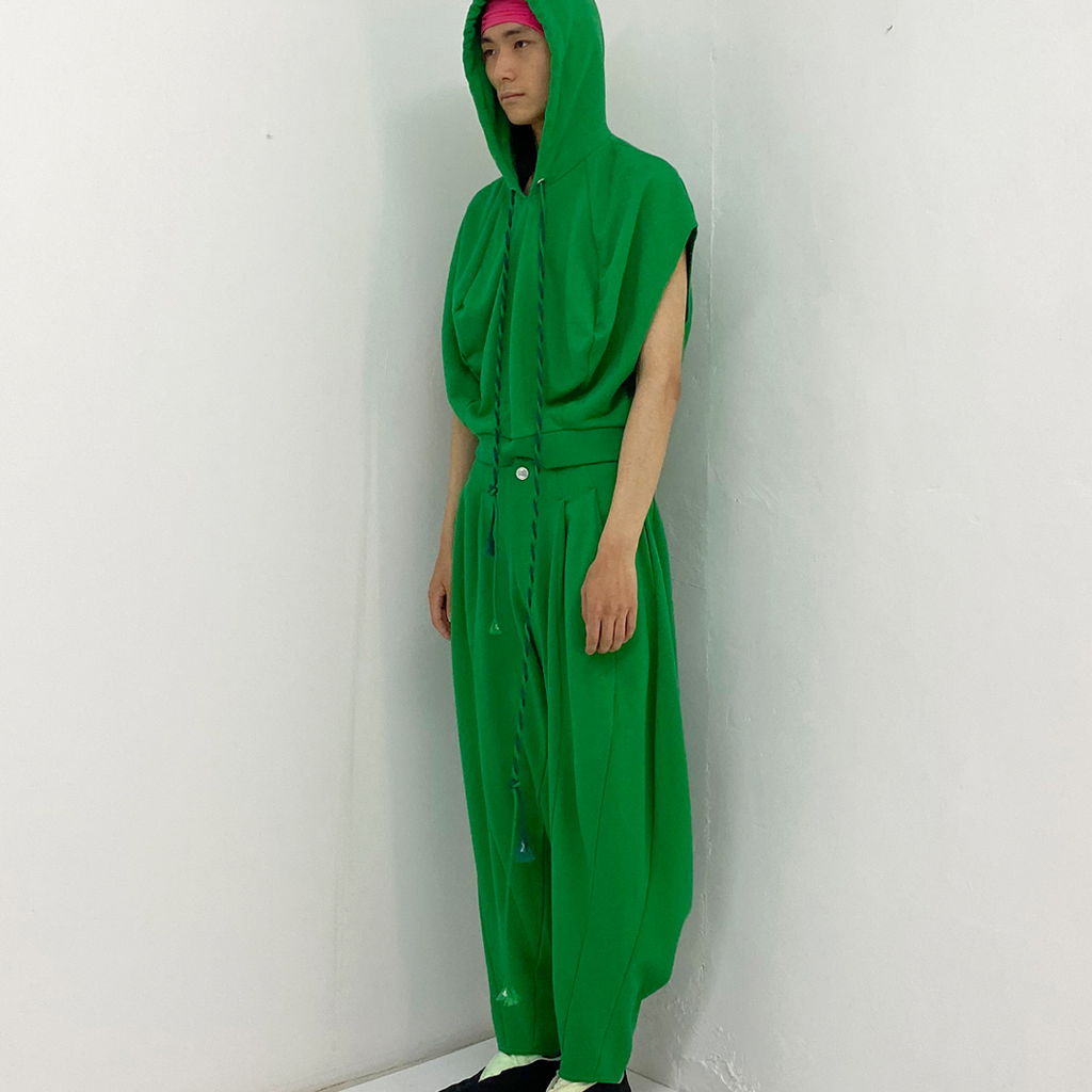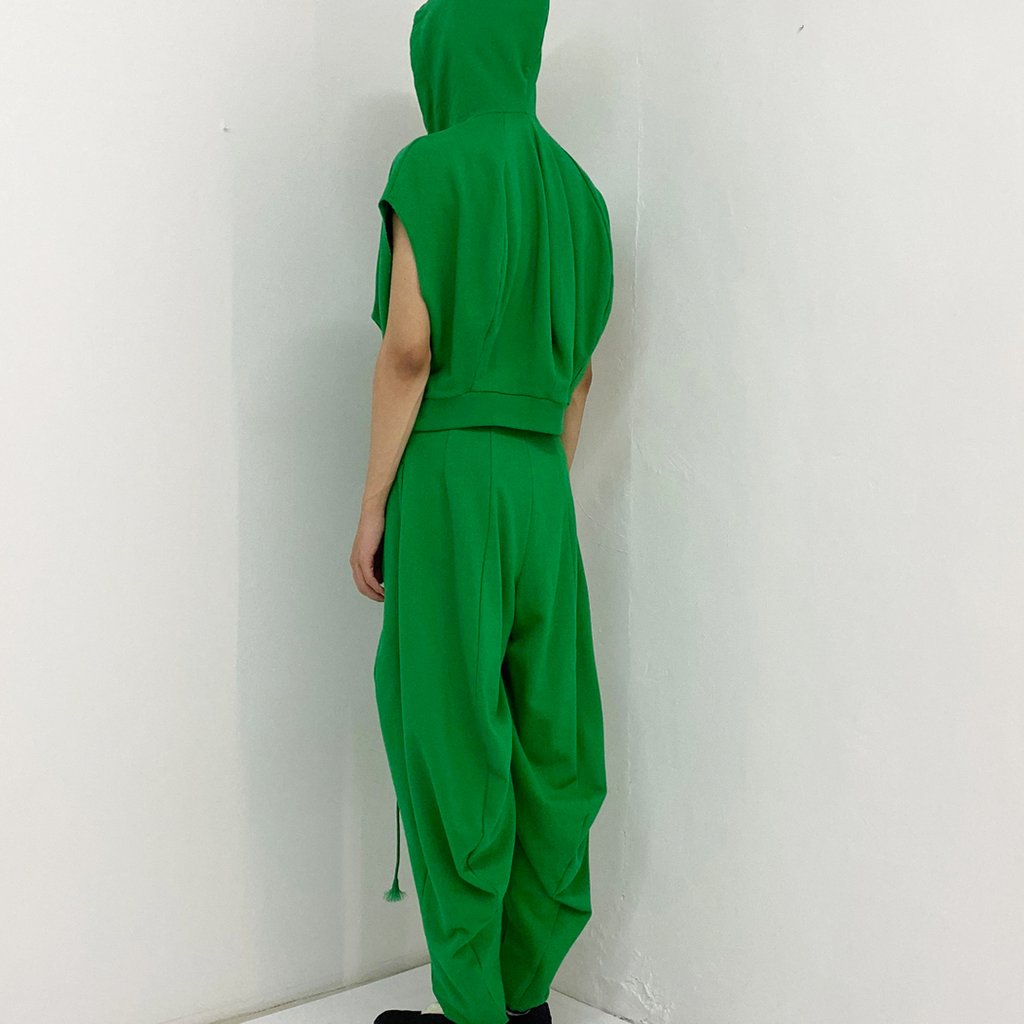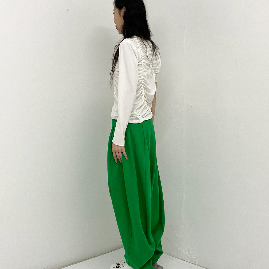Woe cotton jersey pant by SUNG JU. Pleats at front. Two pockets at side seem. Cutting detail at waist and hem. Made in South Korea.