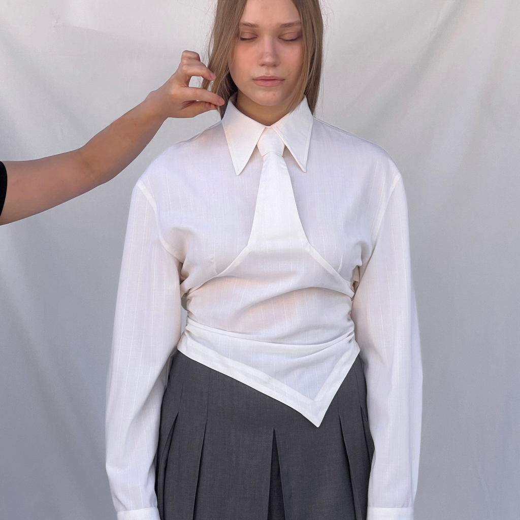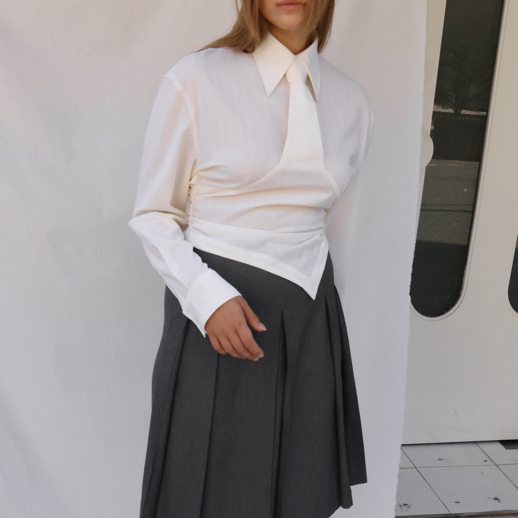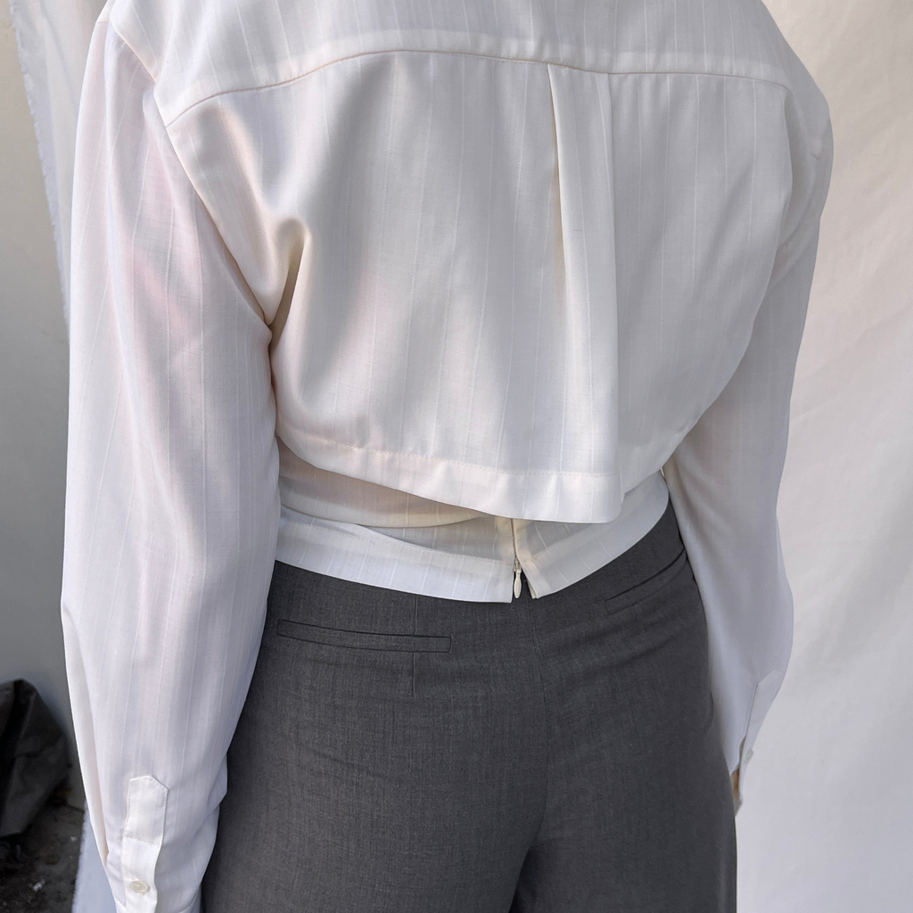 This is a tie shirt made from 100% wool. In this version of the tie shirt, the back panel has been closed to create a cleaner silhouette. We've used a YKK zipper instead of buttons to enhance warmth, making it suitable for fall and winter wear. The shirt features matte mother-of-pearl buttons, and the tie section has been upgraded from a fabric stopper to a metal stopper for improved durability.