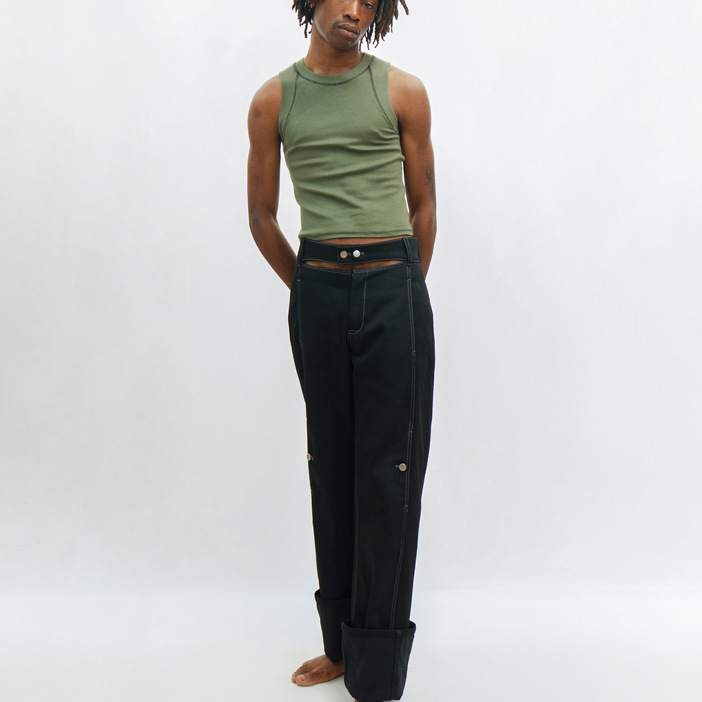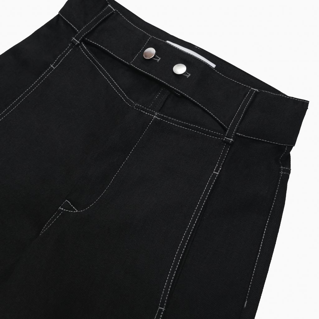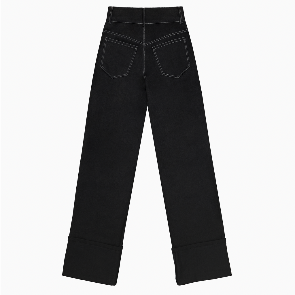 Work jeans with high rise, wide leg and turn up hem. Patch pocket on back and inseam pockets on front and knee area. Made from ISKO R-TWO™ denim.