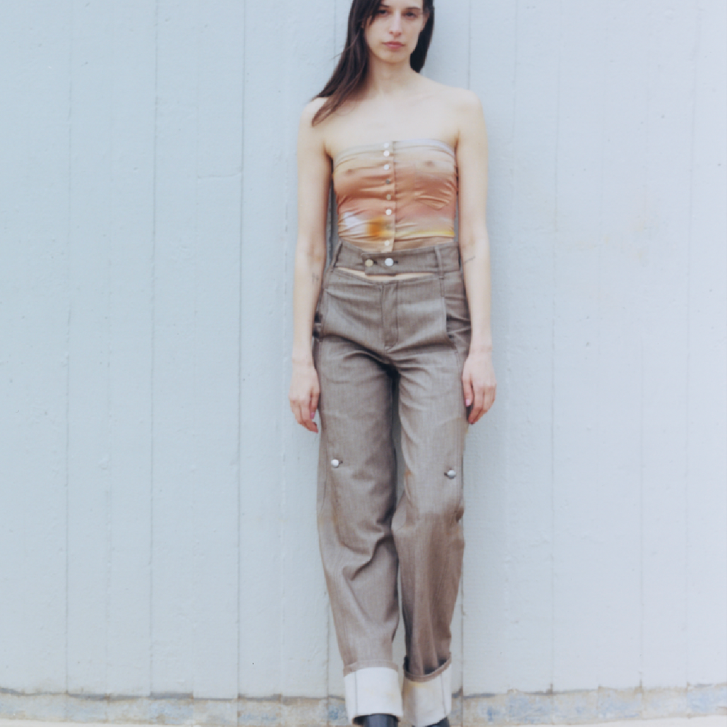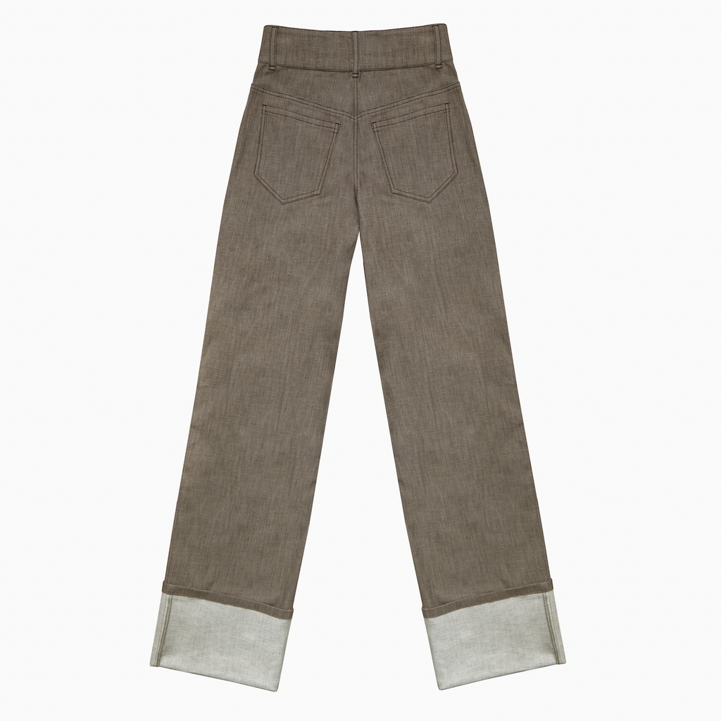 Work jeans with high rise, wide leg and turn up hem. Patch pocket on back and inseam pockets on front and knee area. Made from ISKO R-TWO™ denim.