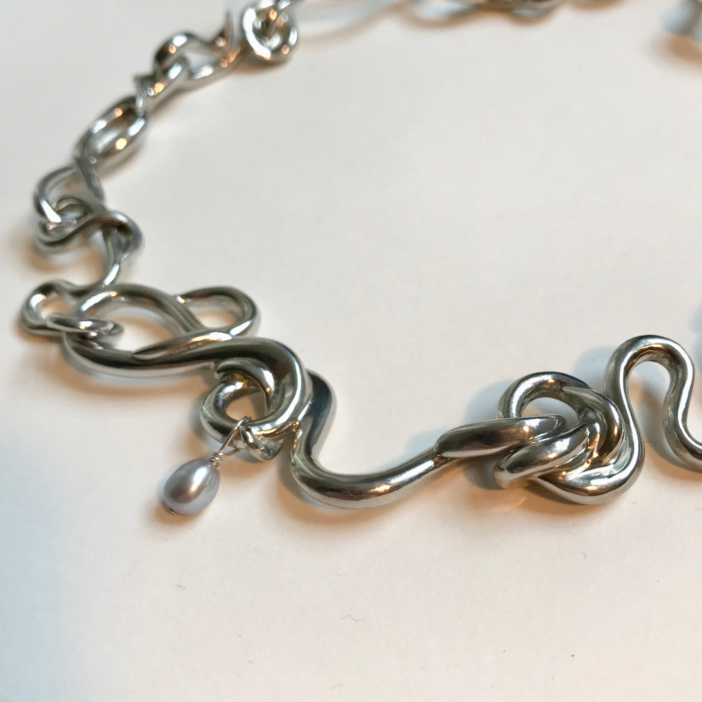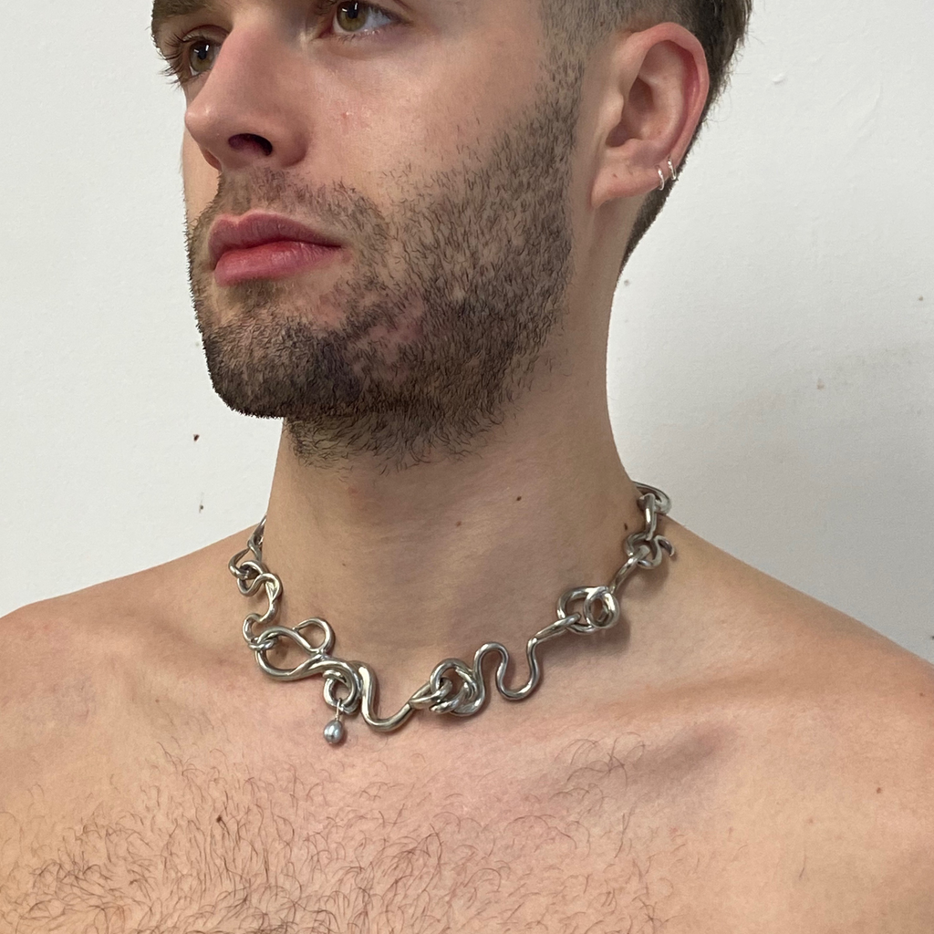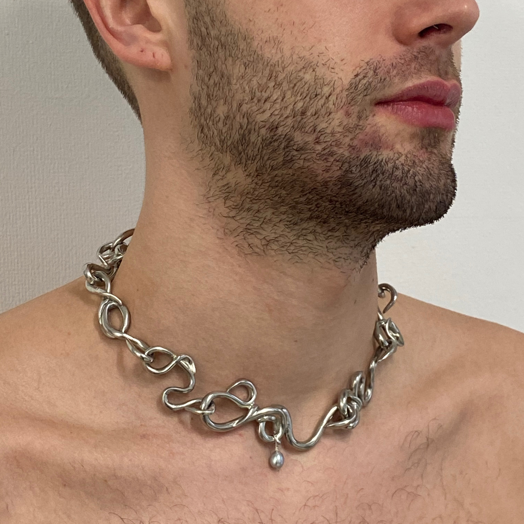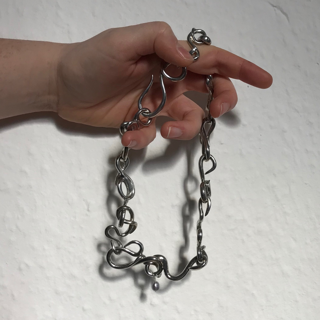 * This chain is hand crafted at every stage by the artist. Due to this, each piece will have different distinguishing marks. It has a hook and loop clasp. The hook goes over your left shoulder with the hook pointing down, and the loop goes over your right shoulder. It can take a bit of fiddling at first to get the links to sit comfortably.