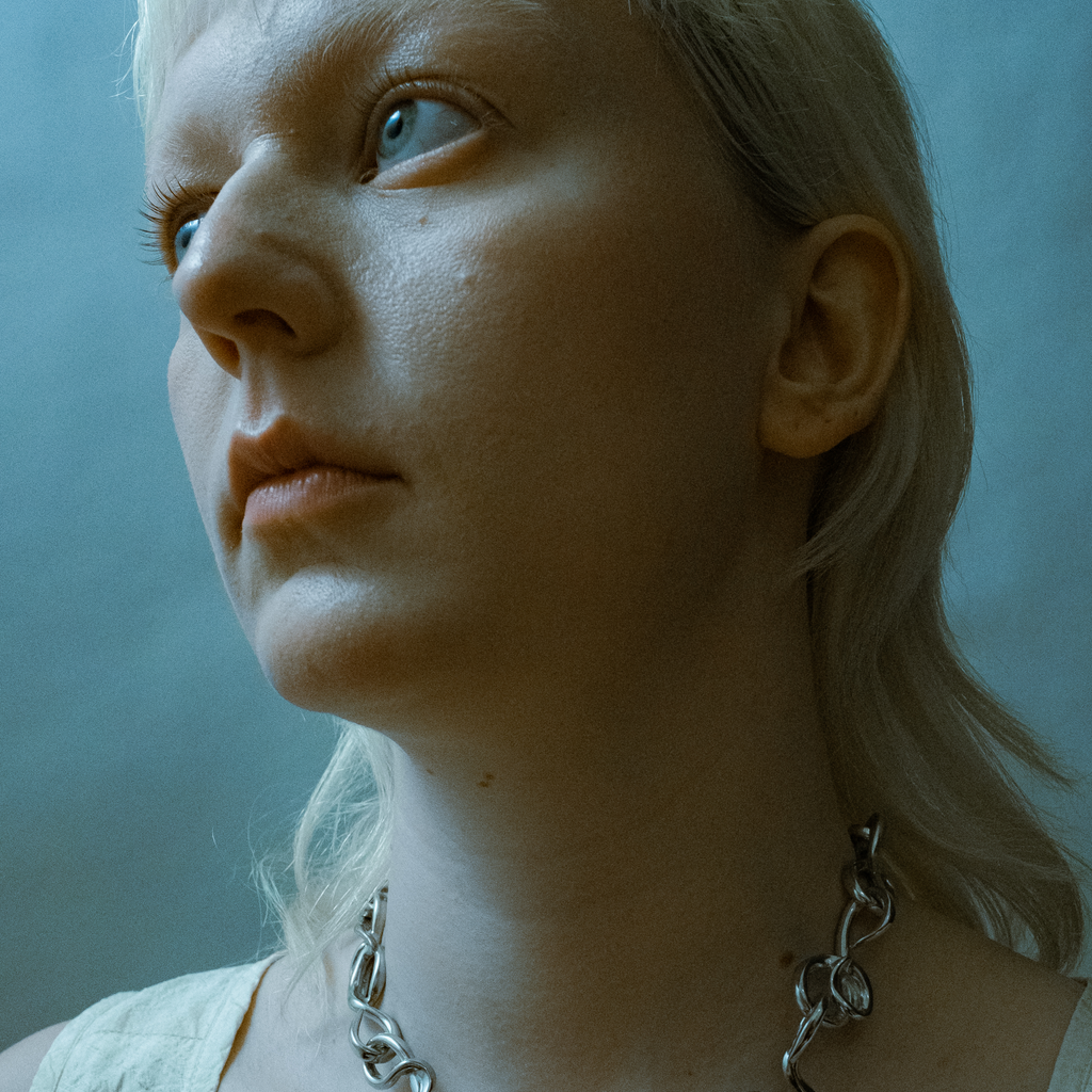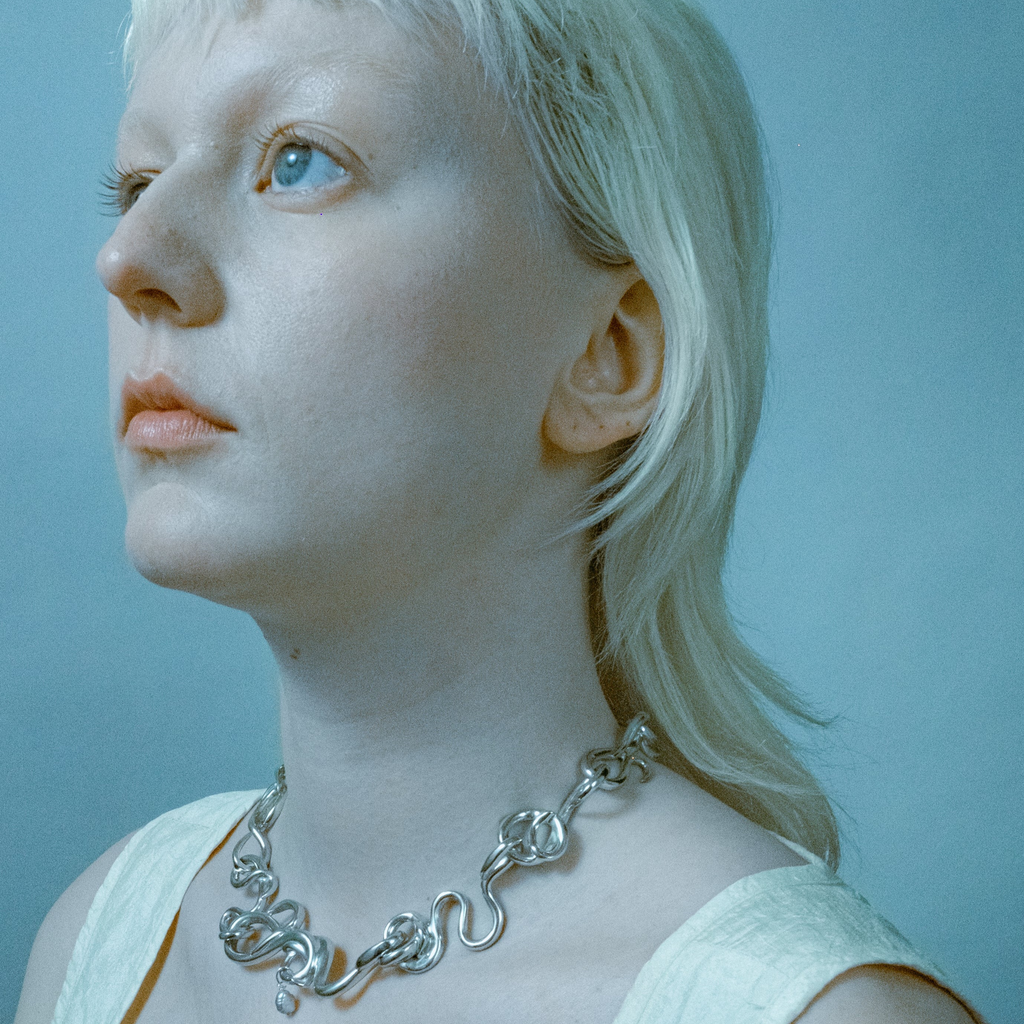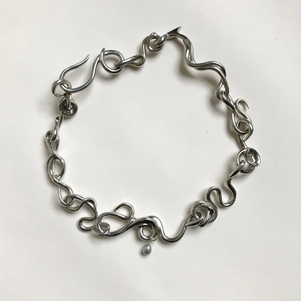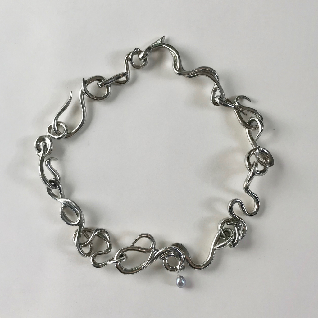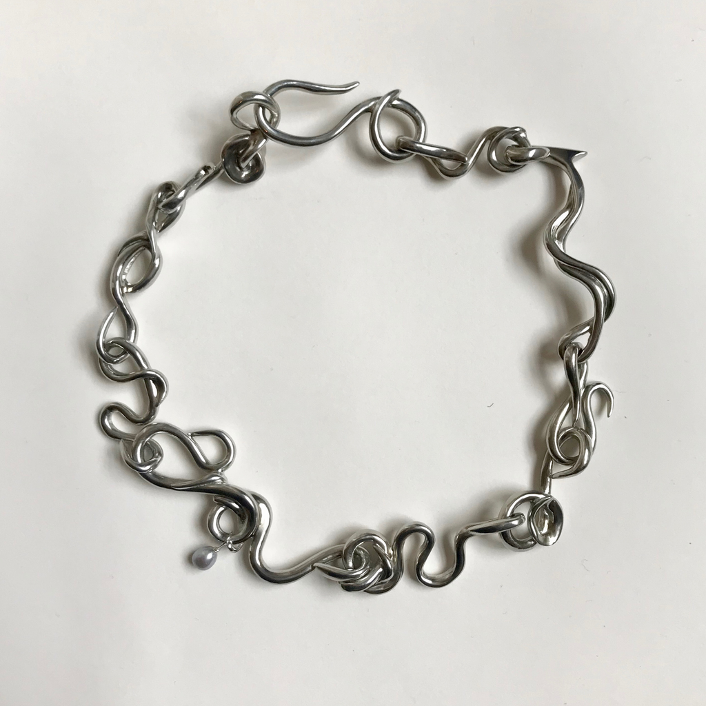 * This chain is hand crafted at every stage by the artist. Due to this, each piece will have different distinguishing marks. It has a hook and loop clasp. The hook goes over your left shoulder with the hook pointing down, and the loop goes over your right shoulder. It can take a bit of fiddling at first to get the links to sit comfortably.