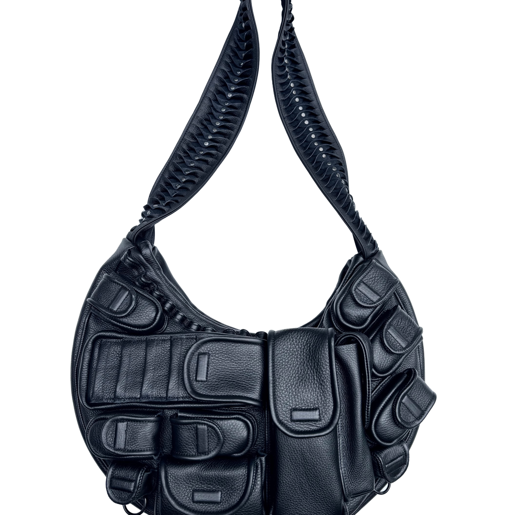 Xl Utility Bag by GRECO constructed German cowhide exterior and interior. 12 exterior magnetic gravity pockets. Two D rings for attachments. Loop system for attachments. Spinal strap with rivets hammered by hand. Interior magnetic lining pockets. Triple magnetic snap closure.