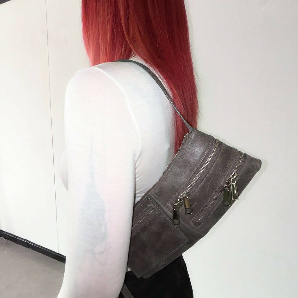 Shoulder bag with pocket/zipper details in vintage grey pull-up leather. Designed to carry everyday essentials, such as a smartphone, small wallet, airpods, lipsticks and keys.